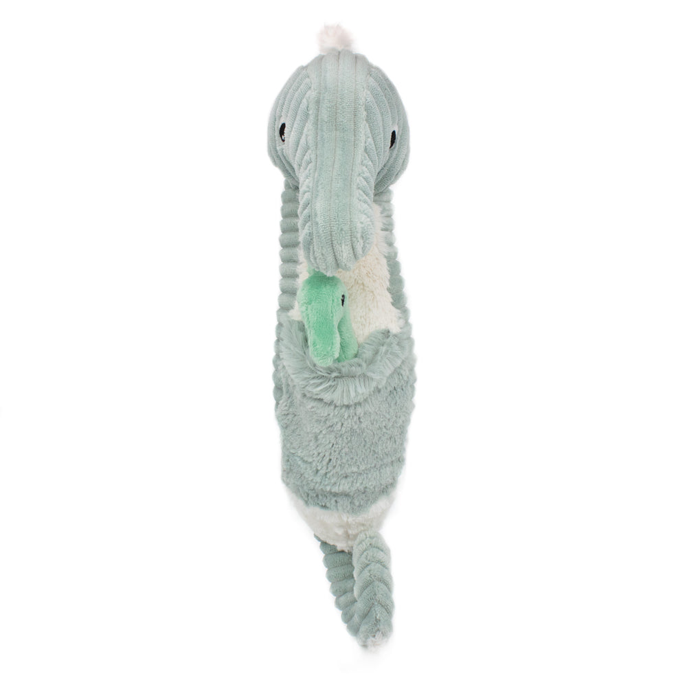 Este precioso caballito de mar en tono mint llega acompañado de su bebé guardado en una suave bolsita. Un peluche lleno de ternura, ideal para abrazar, decorar o como primer compañero de juegos. Diseñado para despertar la curiosidad marina y promover el juego simbólico desde el primer día.