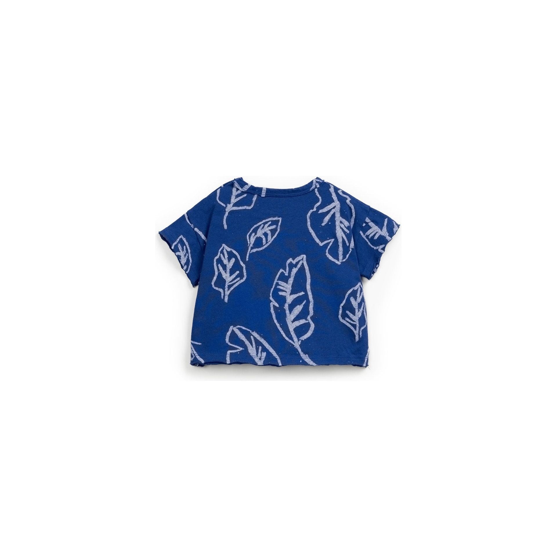 Esta camiseta de la marca Play Up está confeccionada en una suave mezcla de algodón orgánico y algodón reciclado, ofreciendo una prenda cómoda y respetuosa con el medio ambiente para los más pequeños. Su diseño presenta un delicado estampado de hojas en tonos azules , aportando un toque  encantador al vestuario del bebé.