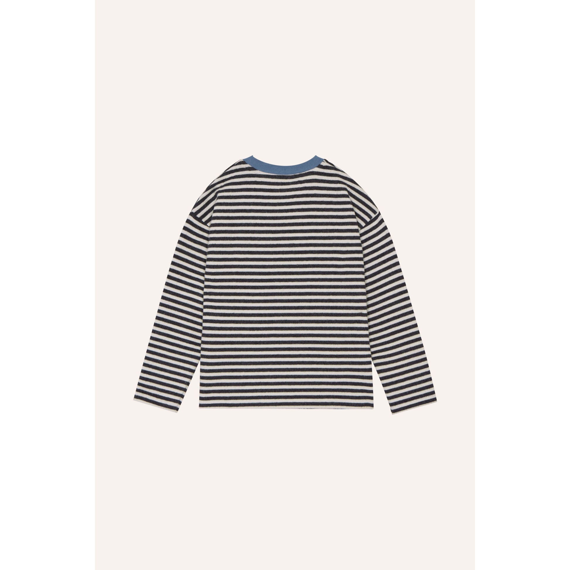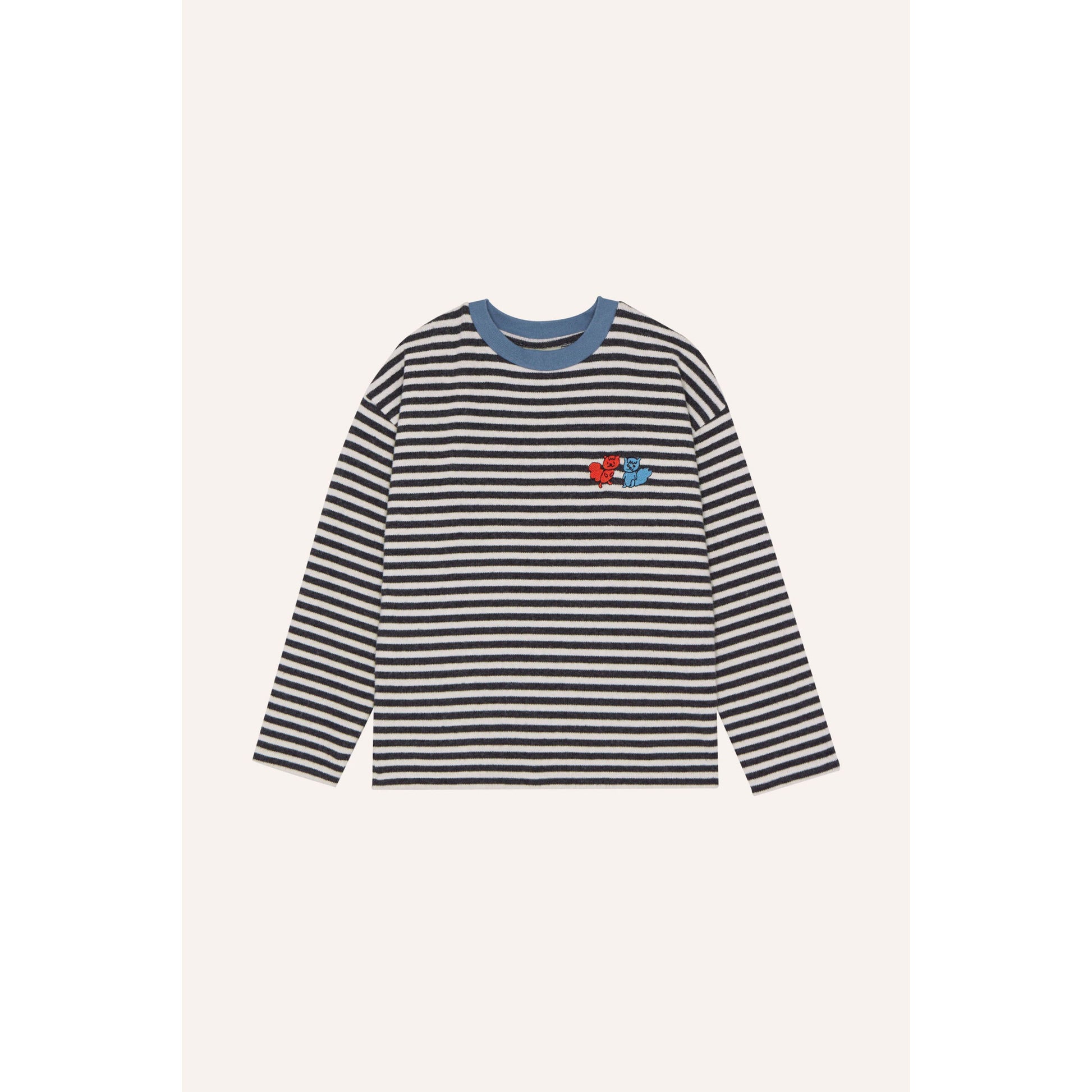 Un básico con alma juguetona. Esta camiseta de manga larga en tejido de canalé fino combina rayas atemporales en blanco y negro con un detalle bordado irresistible: dos ositos, uno rojo y otro azul, compartiendo un abrazo. El cuello azul aporta un contraste divertido que mantiene el equilibrio entre estilo y ternura.