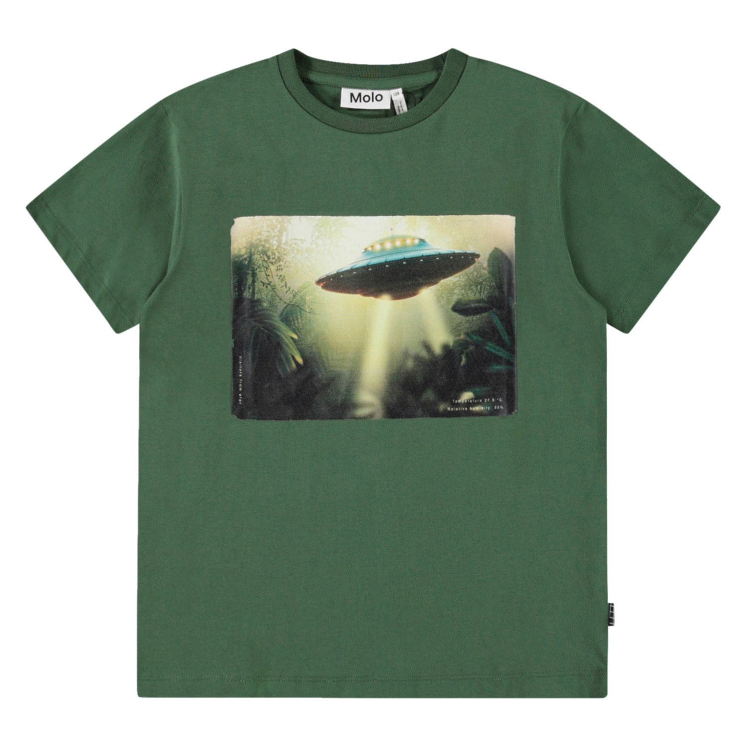 Sumérgete en el misterio galáctico con nuestra camiseta “Ovni” de Molo, confeccionada en suave algodón 100 % orgánico certificado GOTS. Su tono verde profundo sirve de lienzo a un estampado frontal de alta definición: una nave extraterrestre iluminando un bosque al anochecer. Ideal para pequeños aventureros que sueñan con lo desconocido.