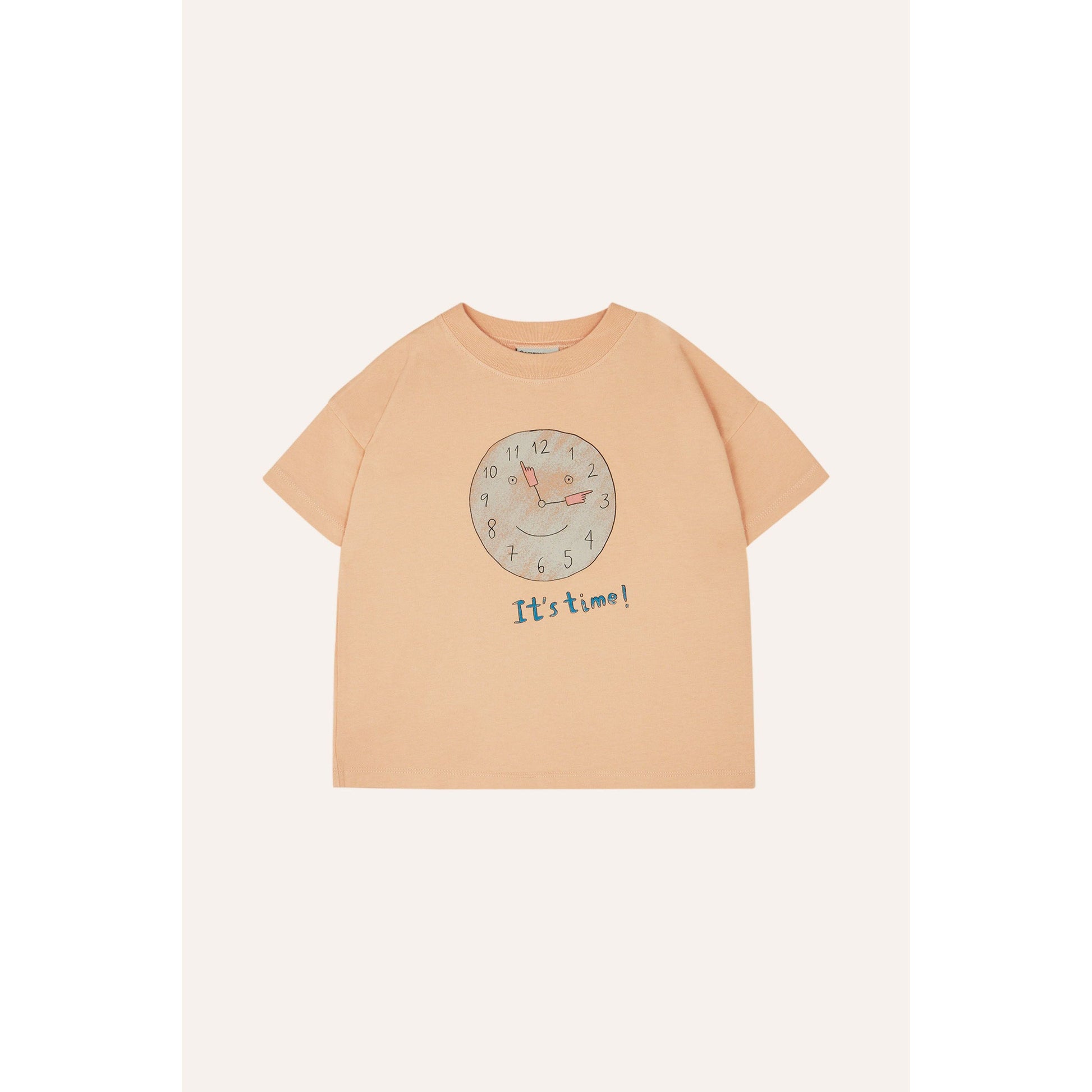 Una camiseta de corte amplio en un suave color melocotón que celebra el momento de cada día con un divertido reloj sonriente serigrafiado en el pecho bajo el lema “It’s Time!”. Su diseño oversize y hombros ligeramente caídos aportan un estilo relajado y contemporáneo, ideal para cualquier aventura.