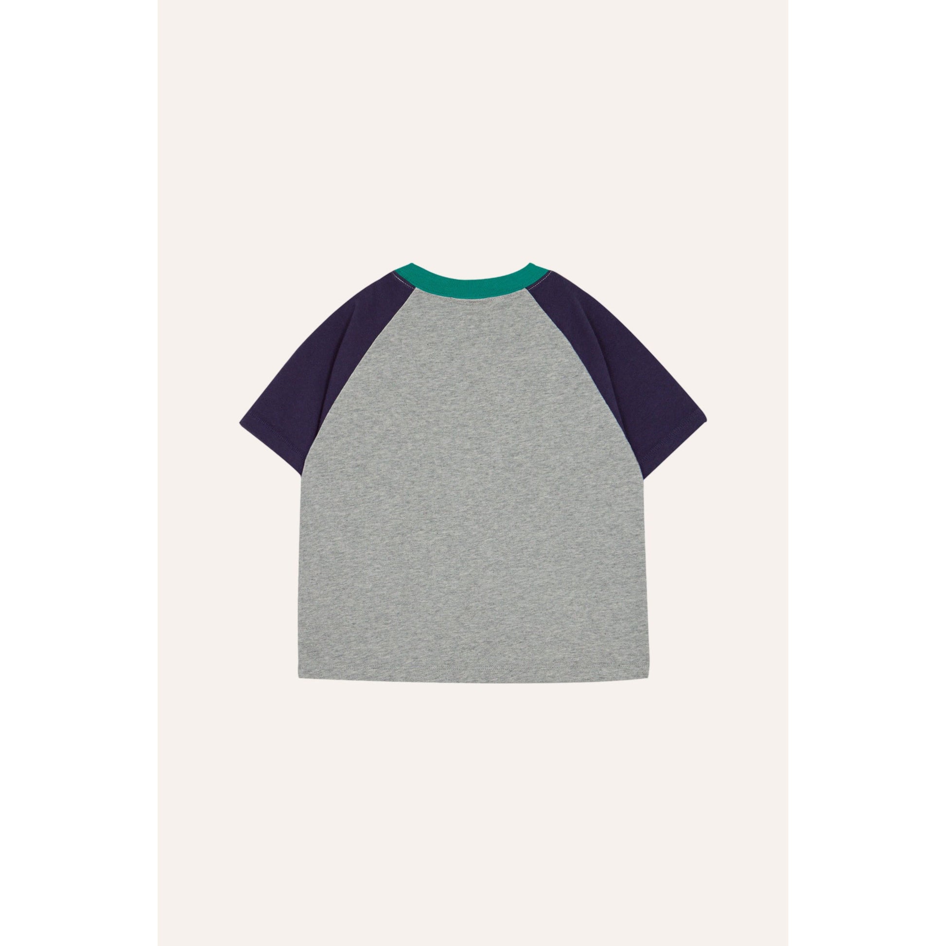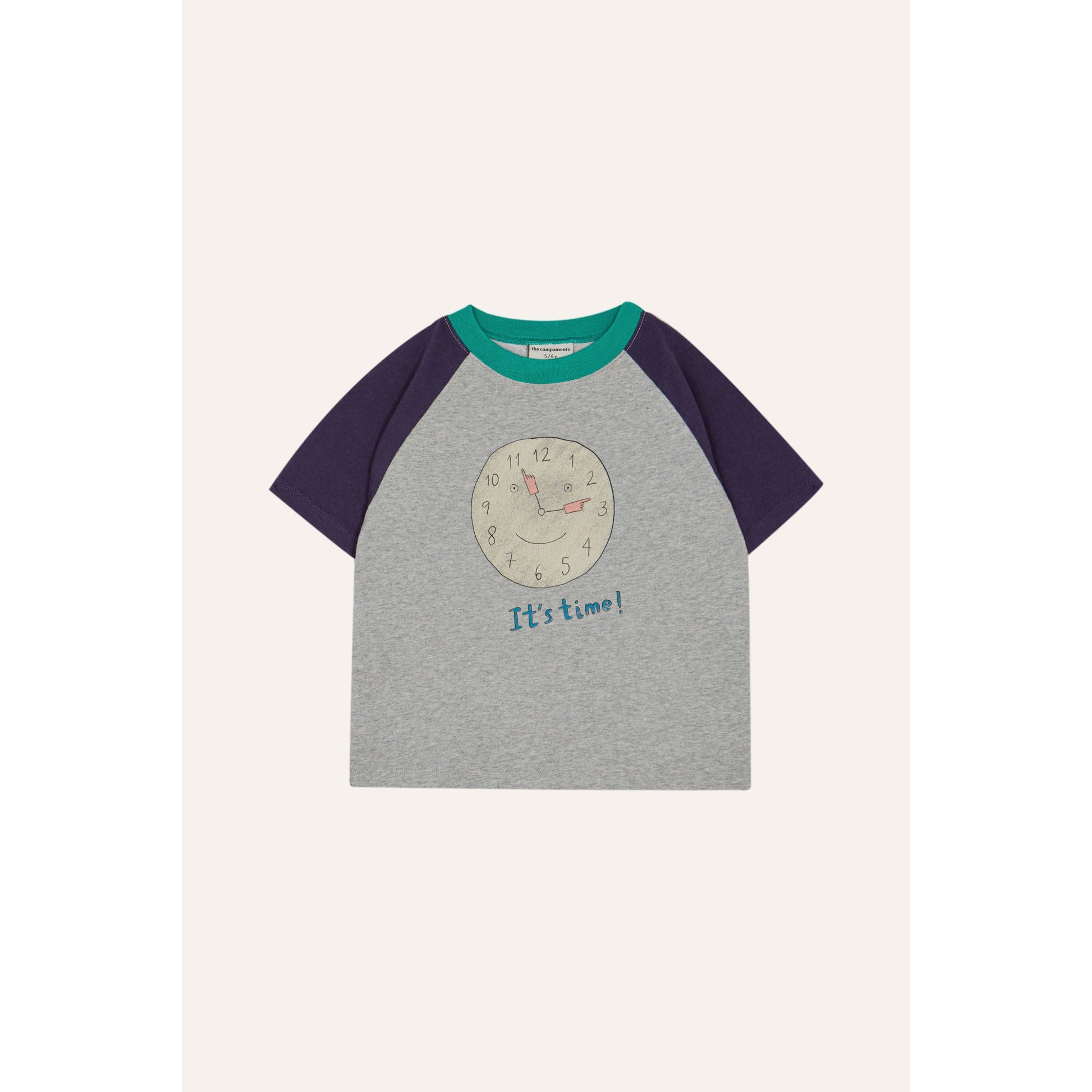 Una camiseta de estilo raglán con cuerpo en algodón gris jaspeado y mangas en azul marino, ribete en verde esmeralda y un estampado central de reloj sonriente acompañado del texto “It’s time!”. Su corte amplio y juvenil, junto con la suavidad del algodón orgánico, la convierten en la compañera ideal para cualquier plan diario con un toque lúdico y desenfadado.