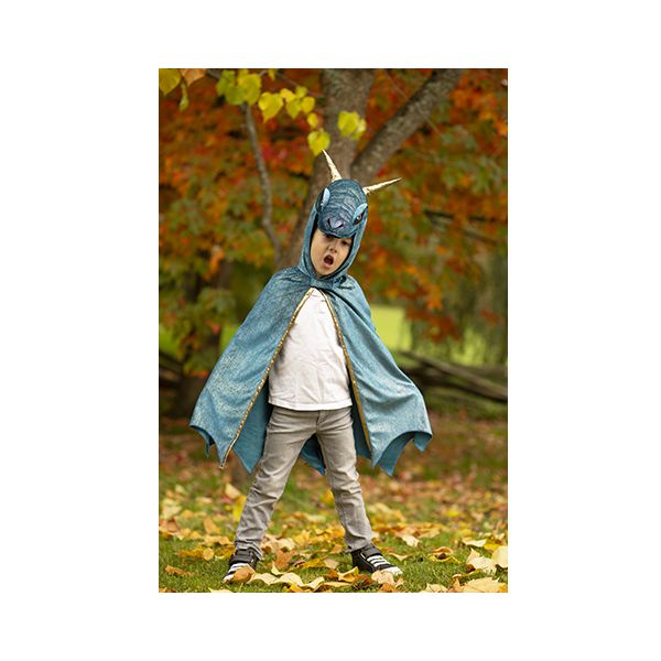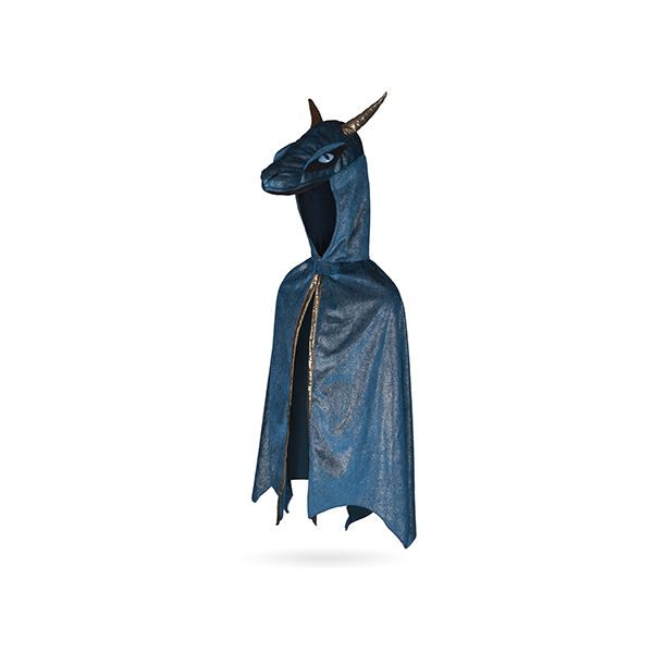 Capa infantil Starry Night Dragon en un azul profundo con escamas brillantes que evocan cielos nocturnos llenos de magia. La capucha recrea la cabeza del dragón con cuernos dorados, aportando carácter sin perder comodidad. Fluida, ligera y envolvente, está pensada para moverse, imaginar y vivir aventuras de fantasía durante horas.
