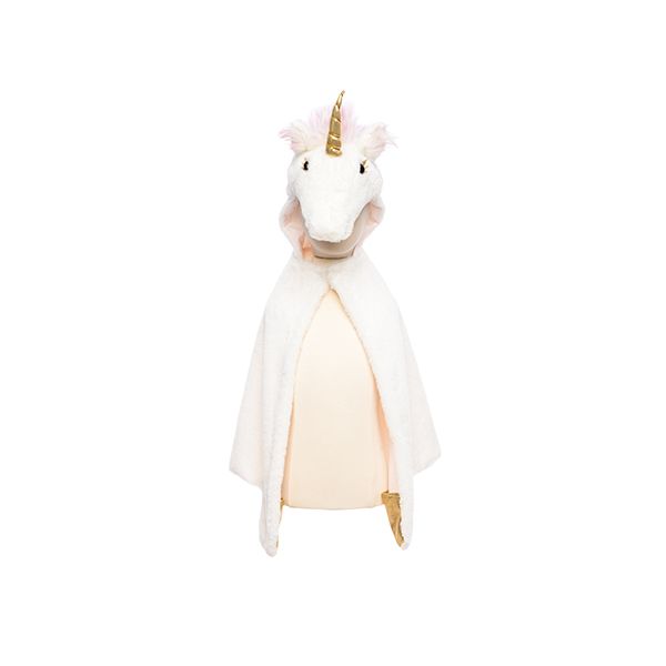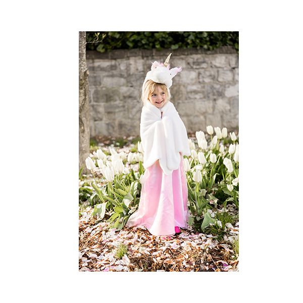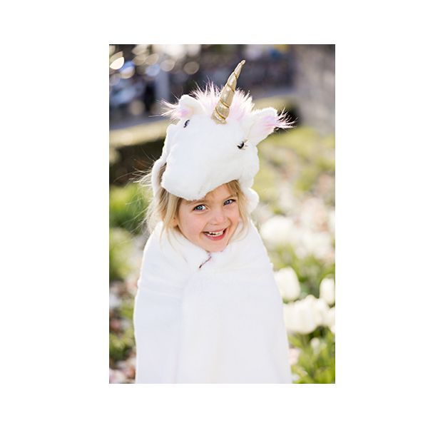 Capa infantil de unicornio confeccionada en felpa blanca ultrasuave, con capucha integrada que da forma a la cabeza del unicornio. Incluye melena rosa, cuerno dorado y bolsillos funcionales, pensados para acompañar el juego sin limitar el movimiento. Una prenda envolvente, cómoda y mágica, ideal para juego simbólico, disfraces y aventuras imaginativas del día a día.