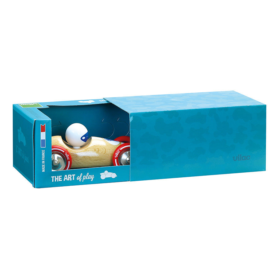 A toda velocidad y con elegancia retro, este coche de carreras de Vilac es una joya de madera maciza. Su carrocería natural de haya deja ver la veta auténtica, mientras que detalles como las ruedas rojas y el dorsal “1” le dan un espíritu ganador. El simpático piloto de bola blanca y casco azul añade un toque de ternura y personalidad.