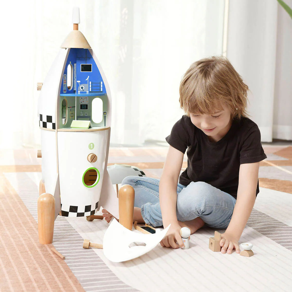 Al abrir sus paneles laterales se descubren 12 salas temáticas: dormitorio, laboratorio, sala de operaciones, gimnasio, zona de mando, área técnica… Un auténtico centro espacial en vertical donde los astronautas pueden vivir, entrenar y explorar nuevos planetas.