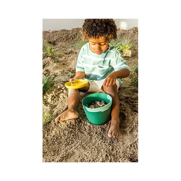 2 en 1: cubo + tamiz con agujeros de distintos tamaños para colar agua, arena o recoger pequeños tesoros.