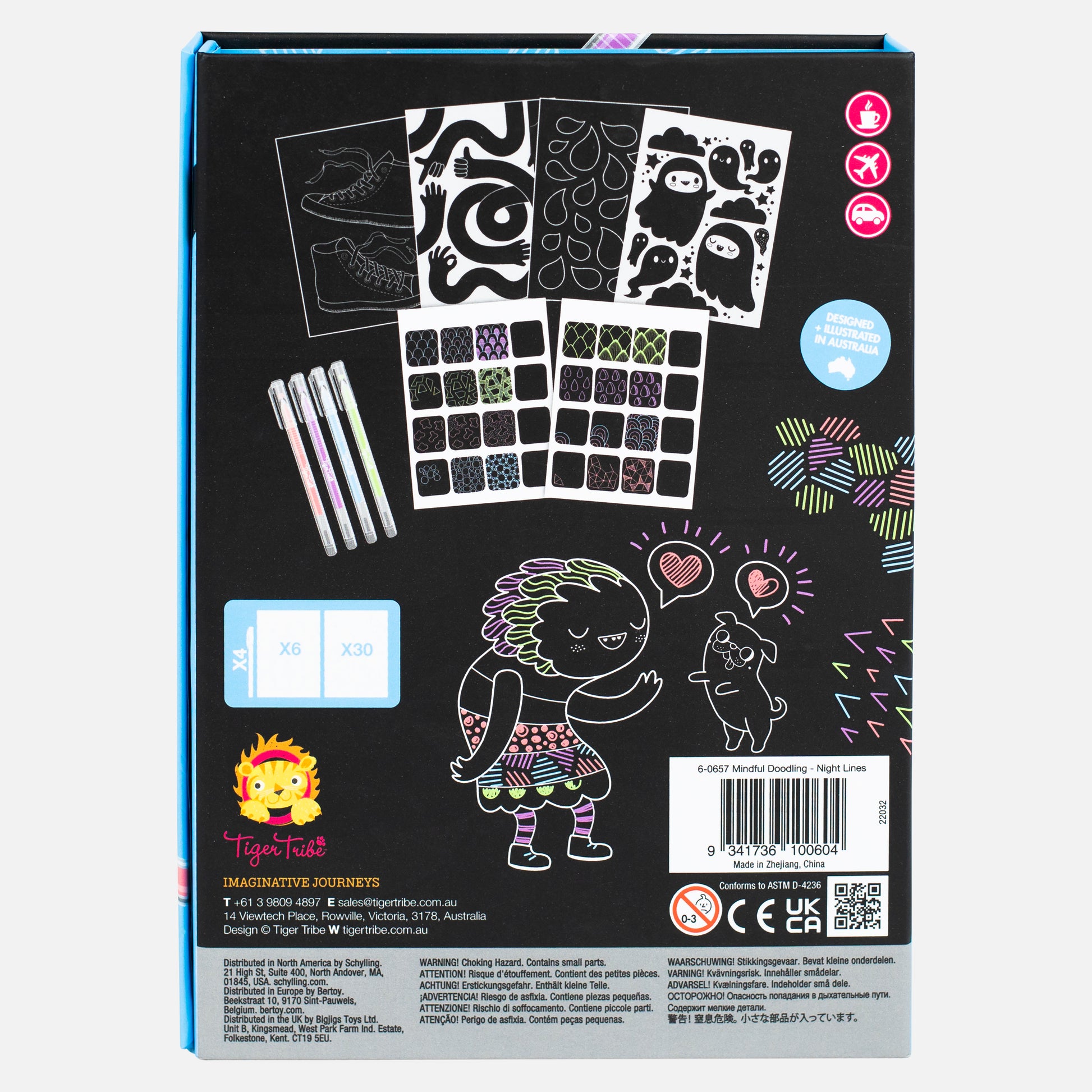 El Set de Dibujo Consciente – Líneas Nocturnas de Tiger Tribe está pensado para desconectar y centrar la mente a través del arte del garabato. Incluye un bloc de páginas con fondo negro y patrones guía que, al rellenarlos con tinta neón, crean contrastes hipnóticos. Perfecto para prácticas de mindfulness y para llevar contigo allá donde vayas.