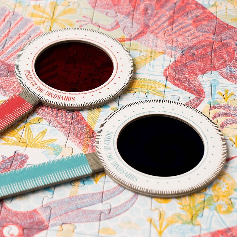 Discover the Dinosaurs es un puzzle de 200 piezas con un giro genial: cuando lo terminas, usas dos lupas de colores para descubrir dos escenas distintas.