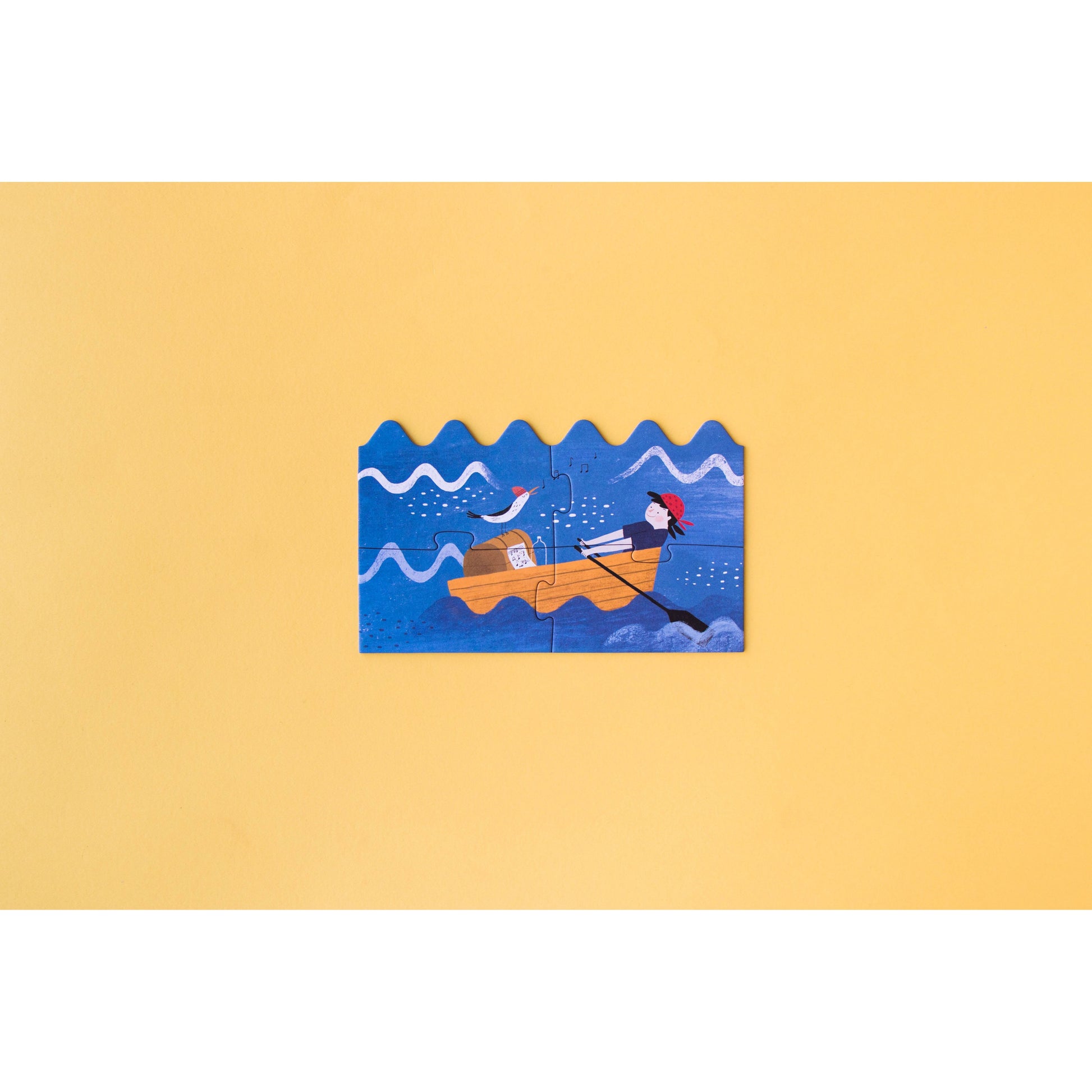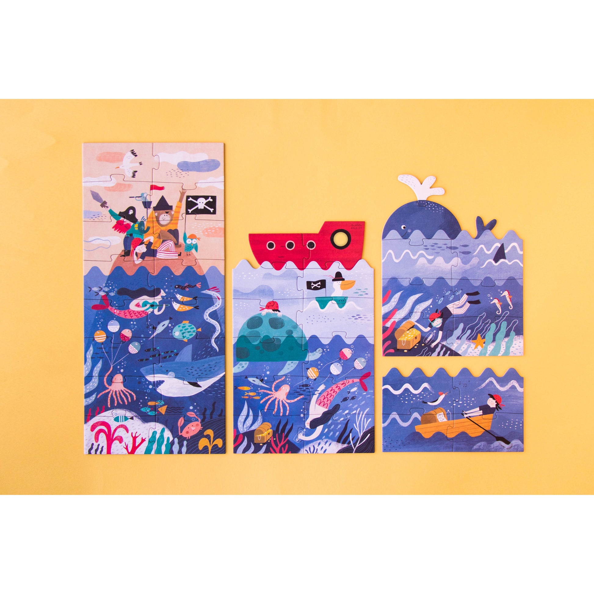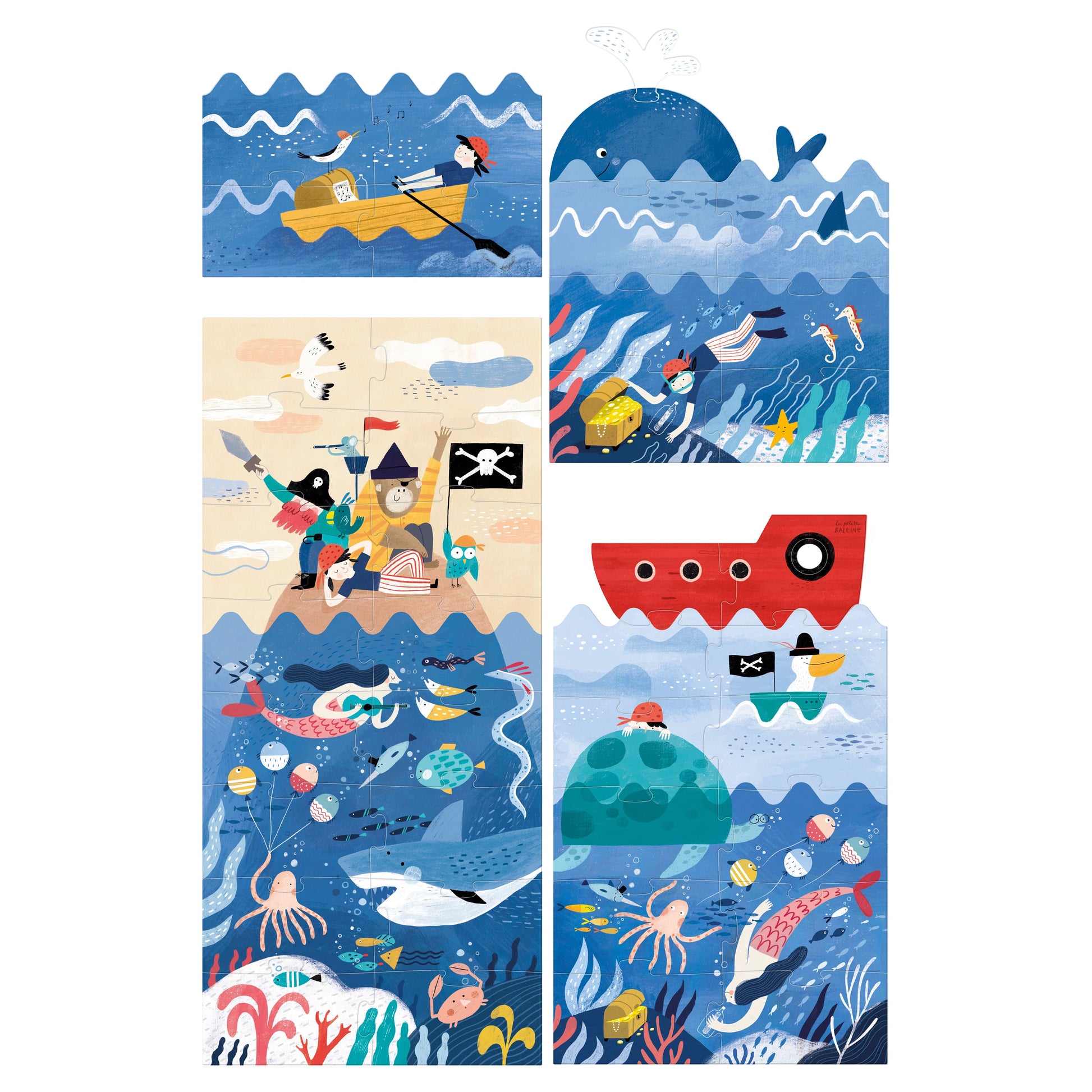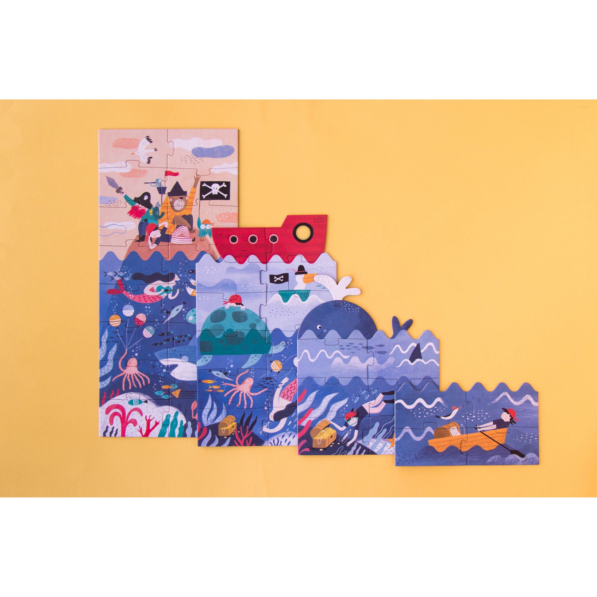 Embárcate en la búsqueda del tesoro con Discover the Treasure, un puzzle por capas que narra una historia de piratas, islas misteriosas y cofres repletos de riquezas. Cada una de las 4 láminas transparentes añade detalles (mar, barco, tripulación y tesoro) hasta completar el escenario final.