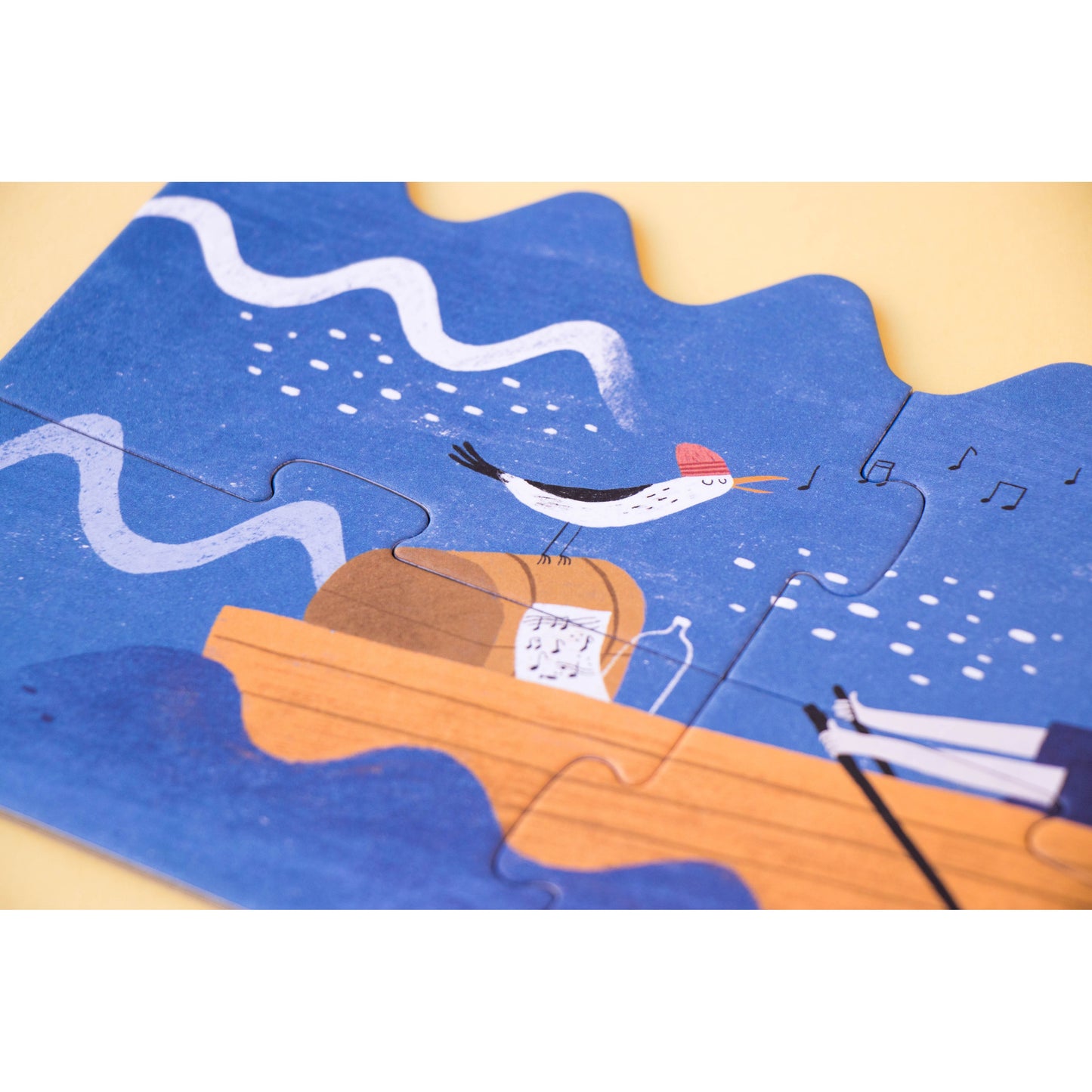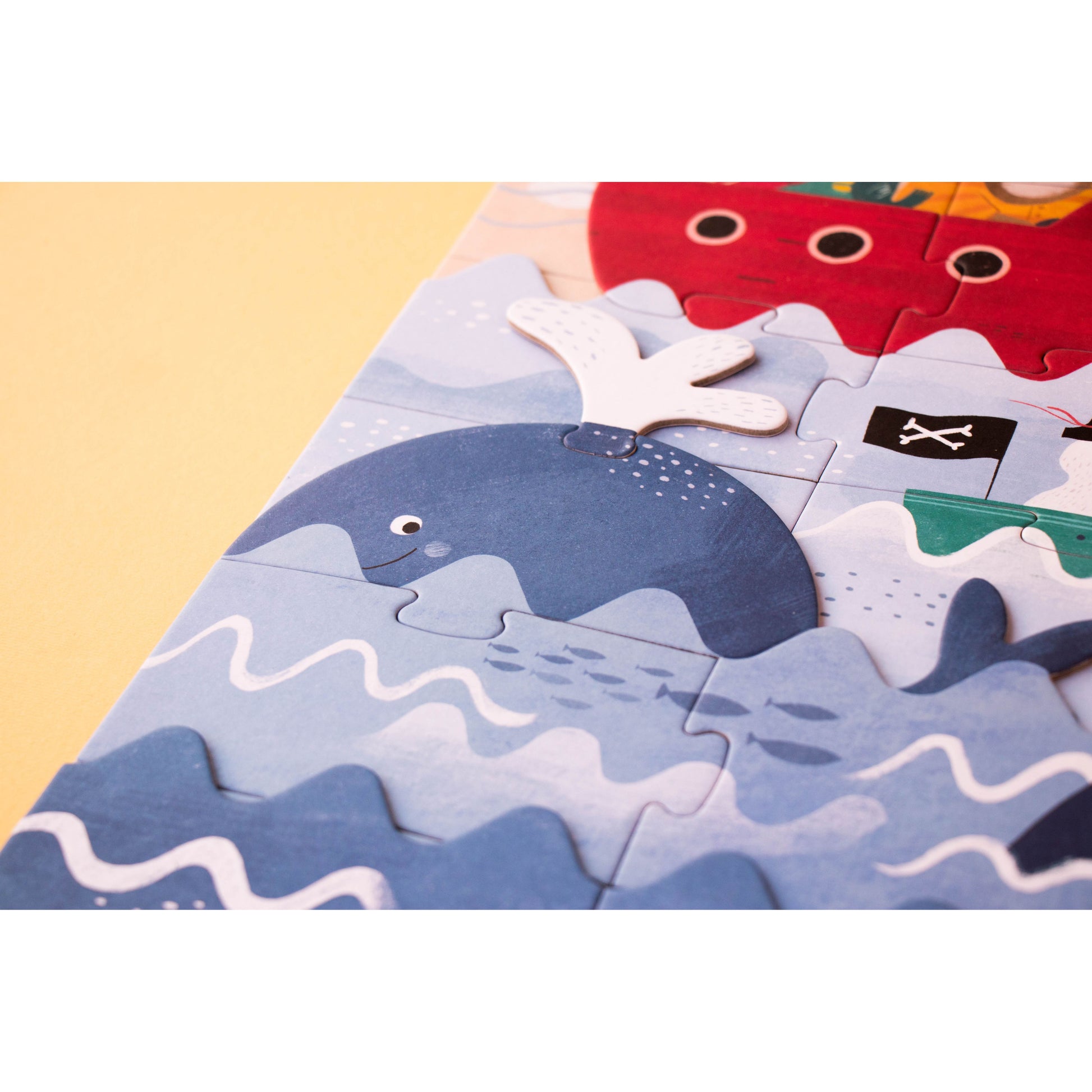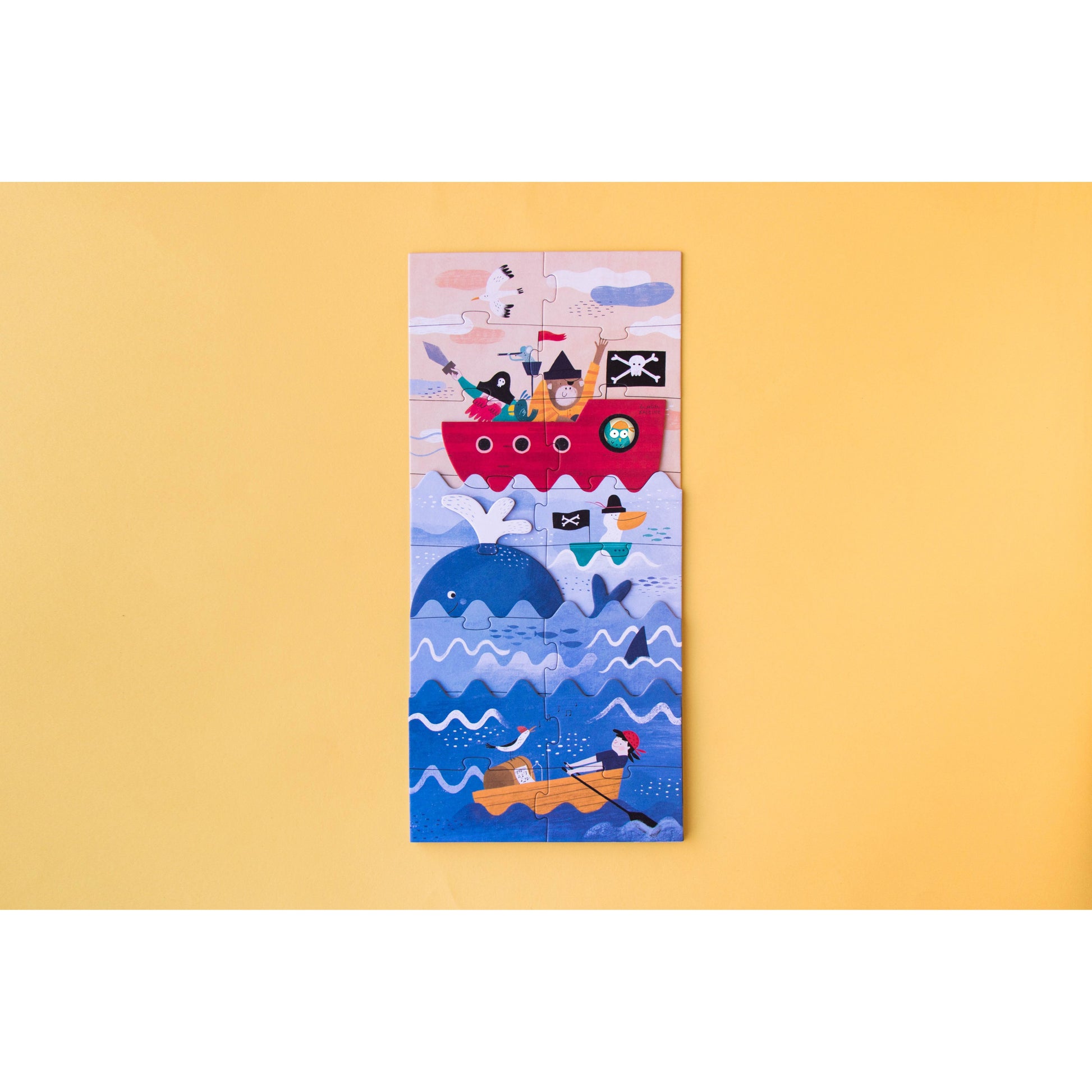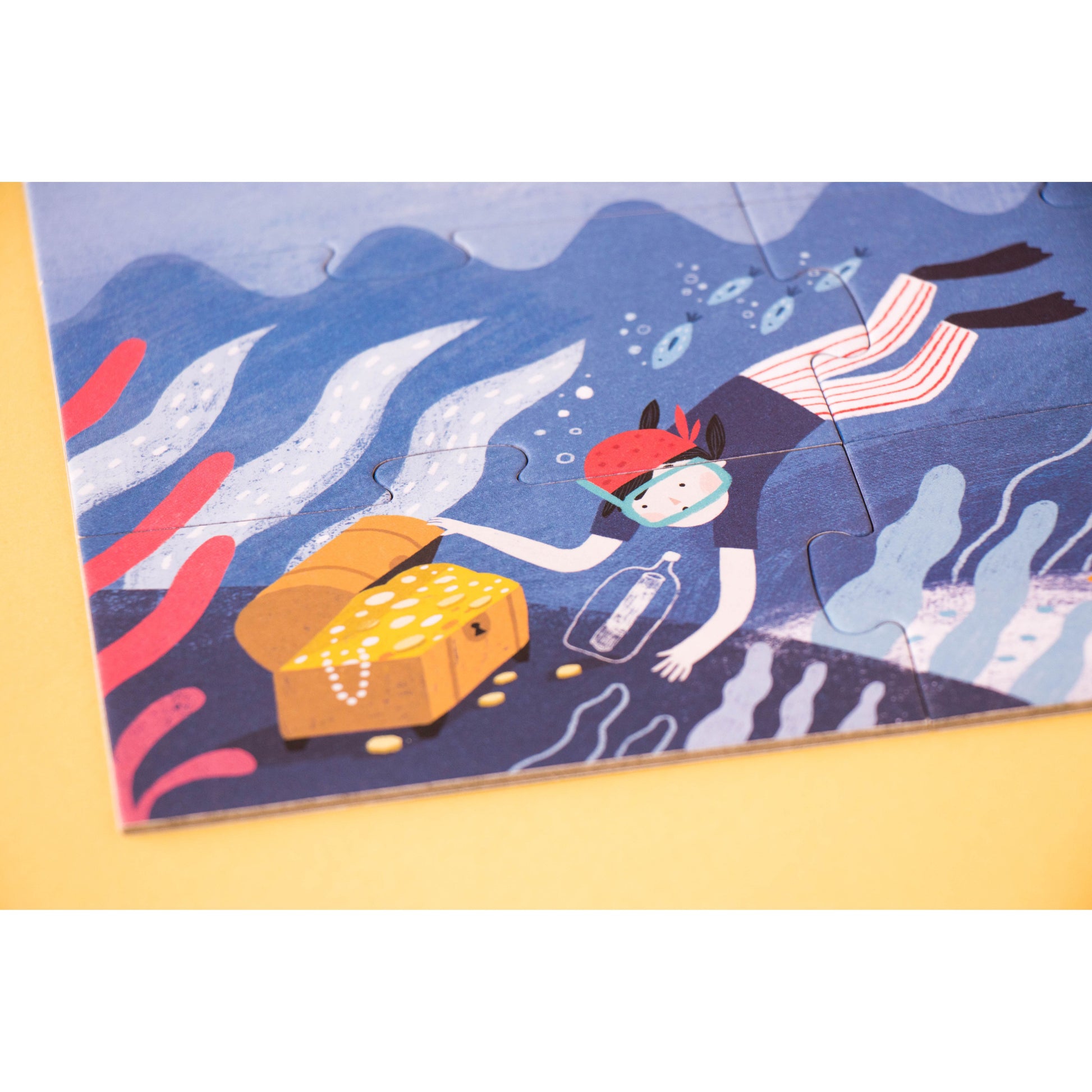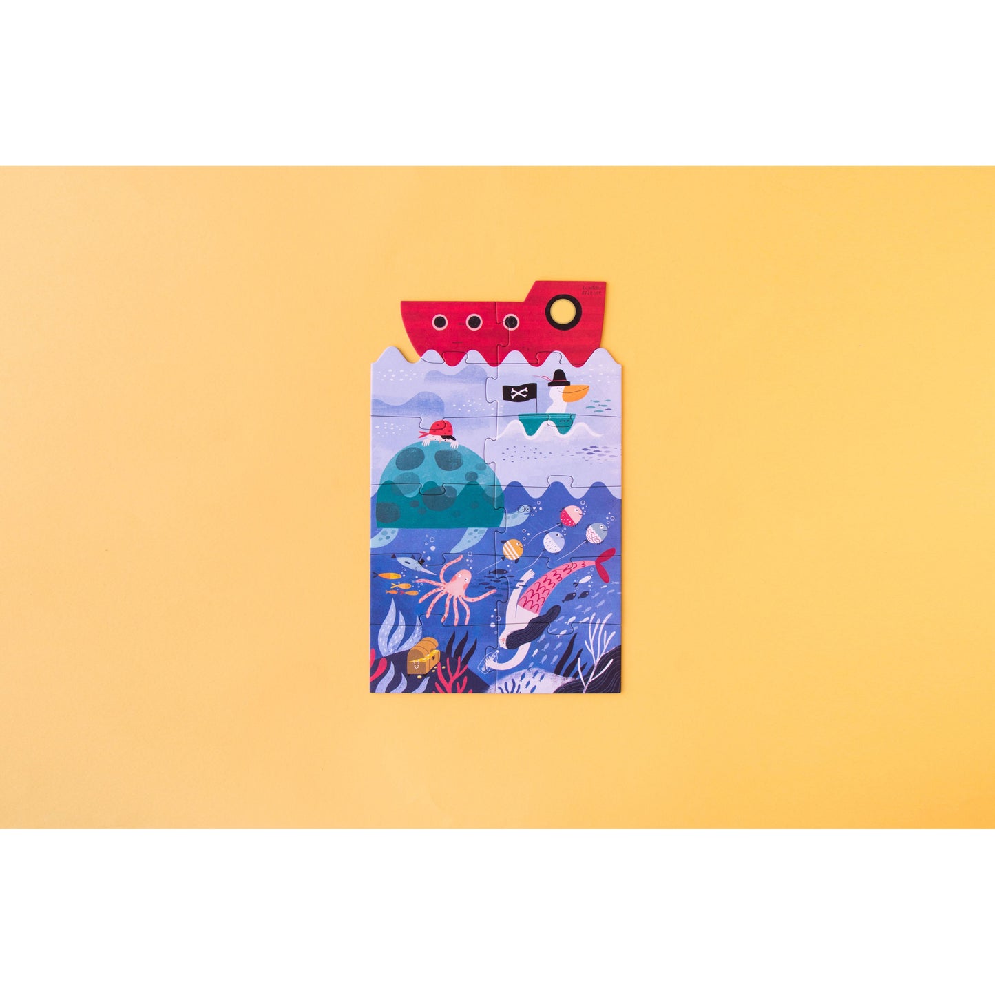 Embárcate en la búsqueda del tesoro con Discover the Treasure, un puzzle por capas que narra una historia de piratas, islas misteriosas y cofres repletos de riquezas. Cada una de las 4 láminas transparentes añade detalles (mar, barco, tripulación y tesoro) hasta completar el escenario final.