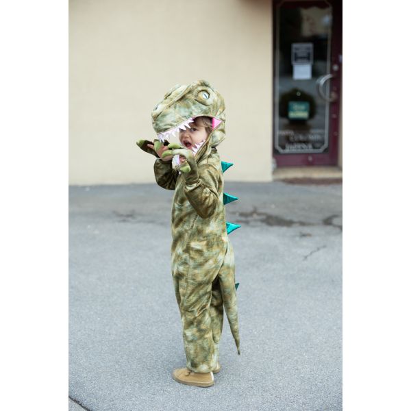 Disfraz infantil completo de T-Rex, diseñado para los pequeños amantes del mundo jurásico. Incluye mono de cuerpo entero con textura y colores realistas, cola integrada y capucha con cabeza de dinosaurio de gran expresividad. Una prenda cómoda y ligera que permite moverse, correr y rugir sin límites, ideal para juego simbólico, disfraces y aventuras prehistóricas.