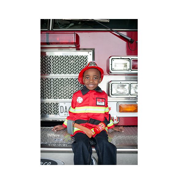 Este set incluye todo lo necesario para convertirse en un bombero de verdad: chaqueta roja con detalles reflectantes, casco, extintor, hacha y placa.