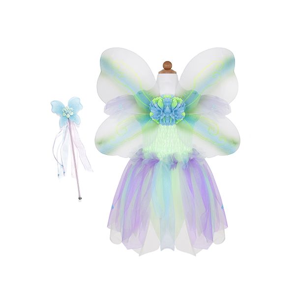 Un vestido mágico en tonos verde menta, lila y azul que convierte cualquier día en un juego de fantasía. Incluye unas espectaculares alas de hada decoradas con destellos iridiscentes y una falda de tul suave y vaporosa. Para completar el look, viene con una varita a juego que añade el toque final de hechizo y luz.