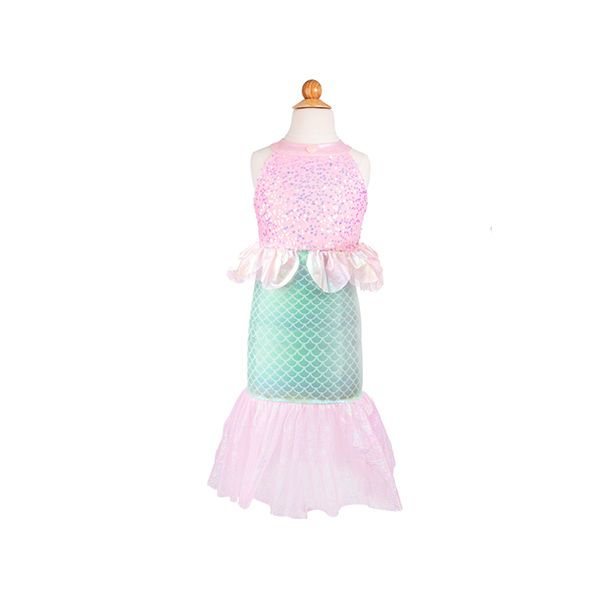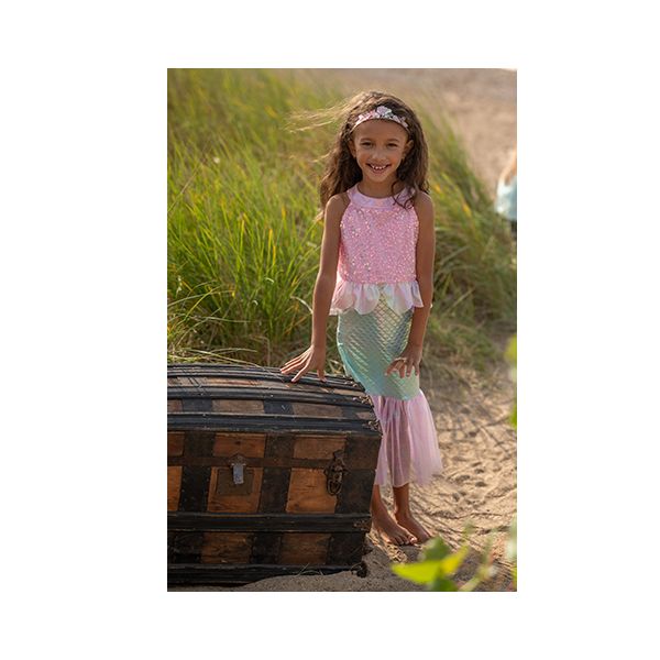 Un vestido que convierte cualquier día en una aventura bajo el mar. Con lentejuelas tornasoladas en el cuerpo, una falda “cola de sirena” en tonos aqua y un volante de tul que se mueve como si estuviera bajo el agua, este disfraz invita a sumergirse en juegos mágicos de playa, océanos imaginarios y búsquedas de tesoros escondidos.