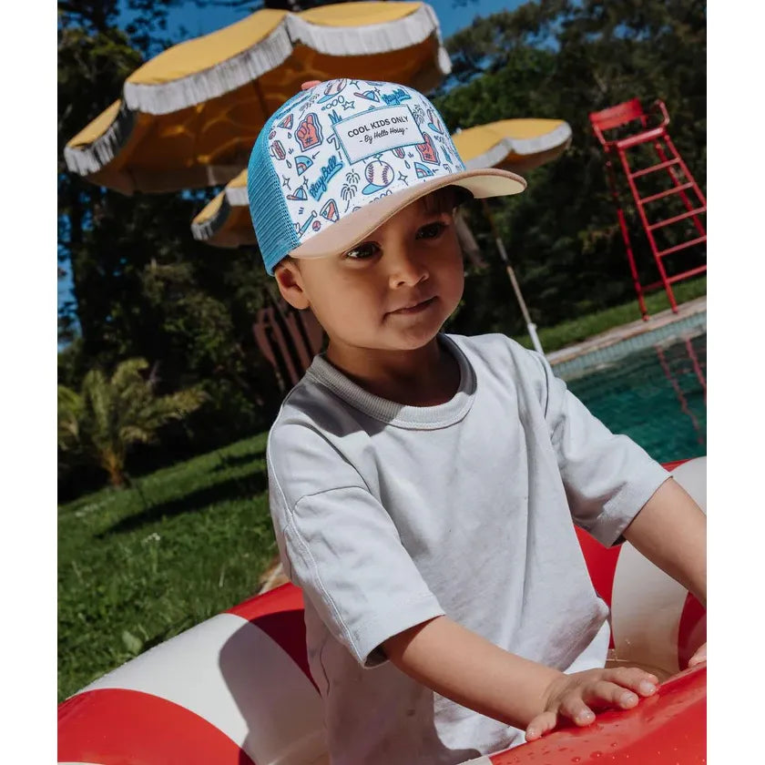 La gorra Baseball Game de Hello Hossy® es un modelo fresco y deportivo, con un estampado inspirado en el mundo del béisbol: pelotas, guantes, números y mensajes divertidos. La combinación de frontal ilustrado, parte trasera de rejilla azul y visera beige la convierte en una gorra cómoda, transpirable y muy veraniega.