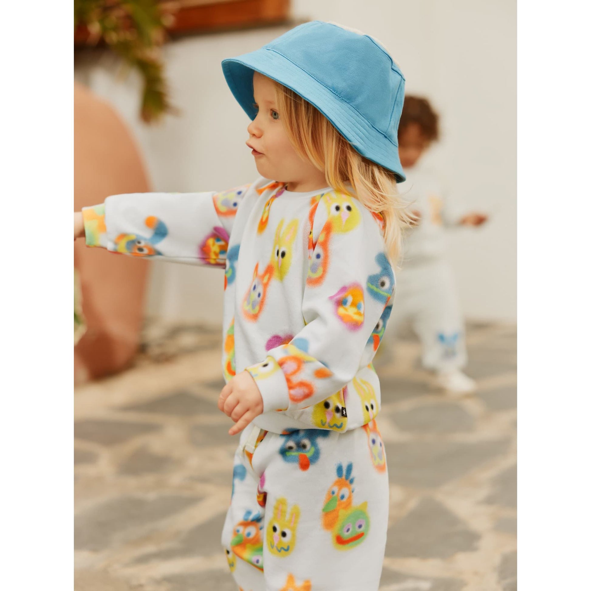 Gorro tipo bucket en azul “Blue Tide”, con un parche smiley en rizo (tipo toalla) en la parte superior que le da ese toque MOLO divertido y reconocible. Un básico con personalidad para días de sol, playa y paseos largos.
