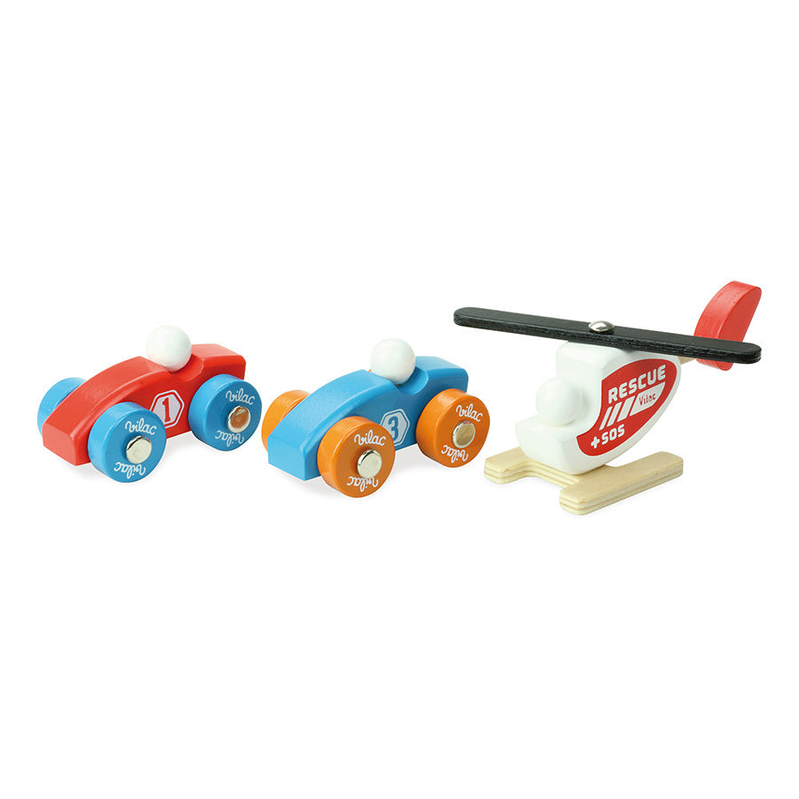 Contenido: 1 garaje de madera, 2 coches y 1 helicóptero.