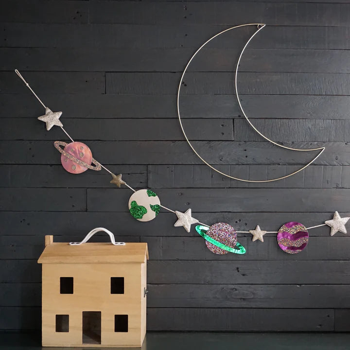 Guirnalda decorativa de Mimi & Lula . Mide aprox. 135 cm y viene montada en cuerda gruesa neutra con bucles en ambos extremos para colgar en un momento. Los planetas mezclan tejidos metalizados y glitter; las estrellas son acolchadas en glitter dorado. Un toque festivo para la pared, la cama o el rincón de lectura. Advertencias: no apta para menores de 36 meses; contiene piezas pequeñas y cordón largo.