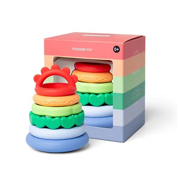 Este arcoíris de texturas y colores está pensado para las manos más pequeñas. Las piezas blanditas se apilan, se desmontan y también sirven como mordedores. Una propuesta de juego sensorial que crece con tu bebé.