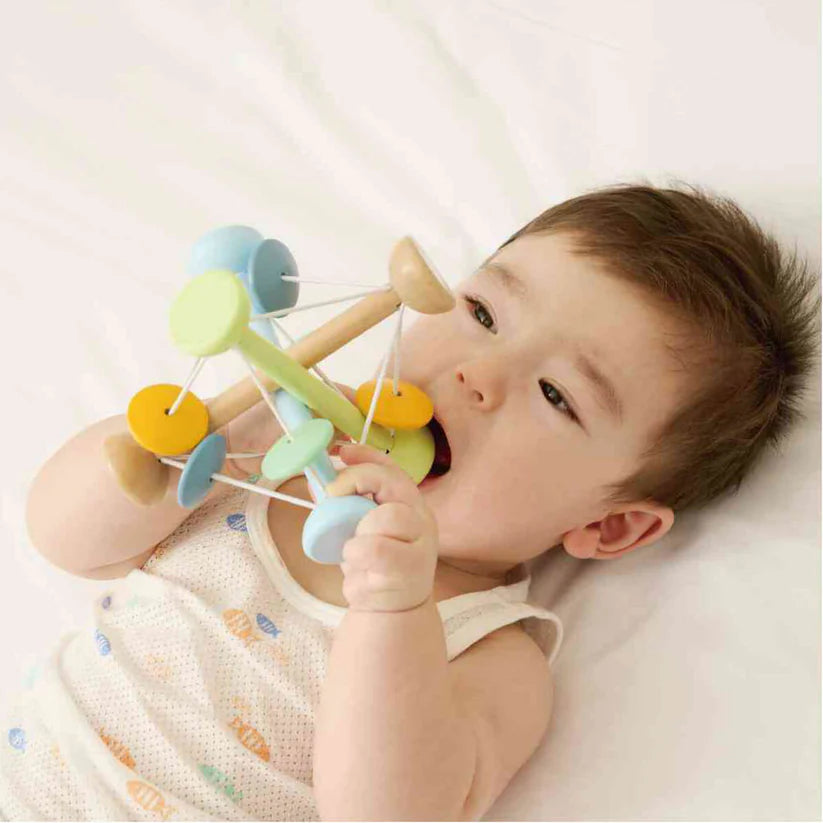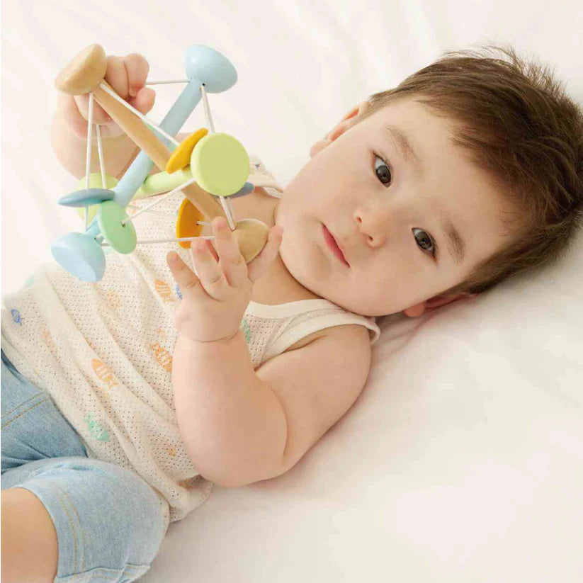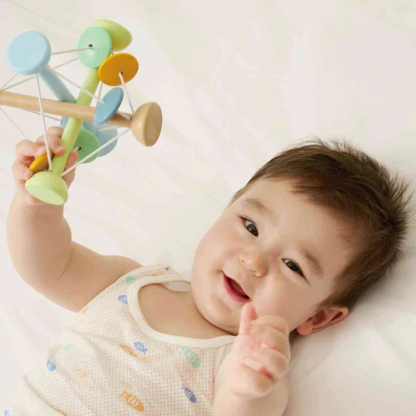 Ligero, flexible y muy fácil de agarrar, este juguete está diseñado para que los bebés exploren con las manos, los ojos y los oídos. Sus varillas elásticas permiten apretarlo suavemente y ver cómo vuelve a su forma, mientras que las piezas de madera crean sonidos naturales y agradables al moverse.