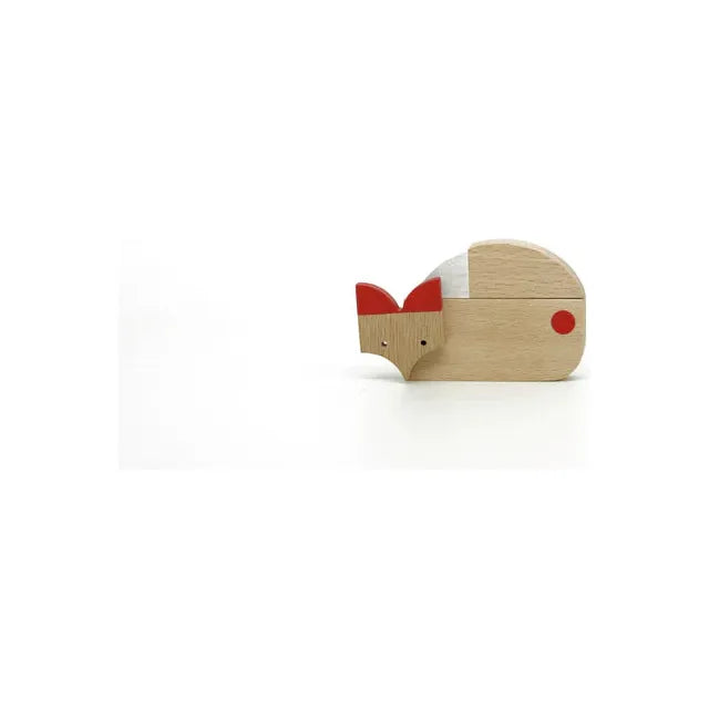 Diseño minimalista y atemporal: Líneas sencillas inspiradas en el bosque nórdico, con la silueta de un zorro en madera clara y detalles en rojo anaranjado.