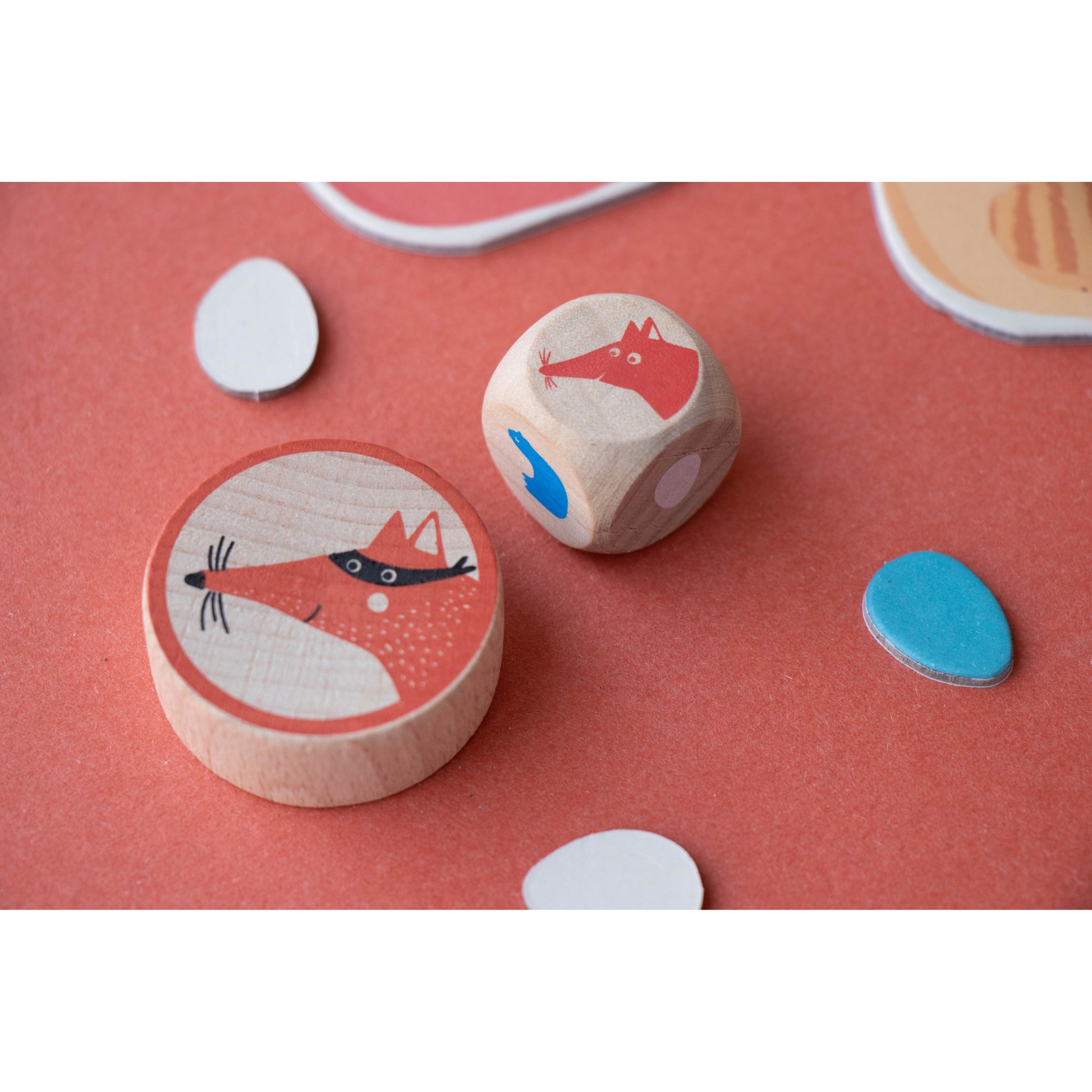 Gana si descartas todas las cartas sin que aparezca el zorro en tu turno; si el zorro sale, ¡el zorro se lleva el huevo y pierdes!