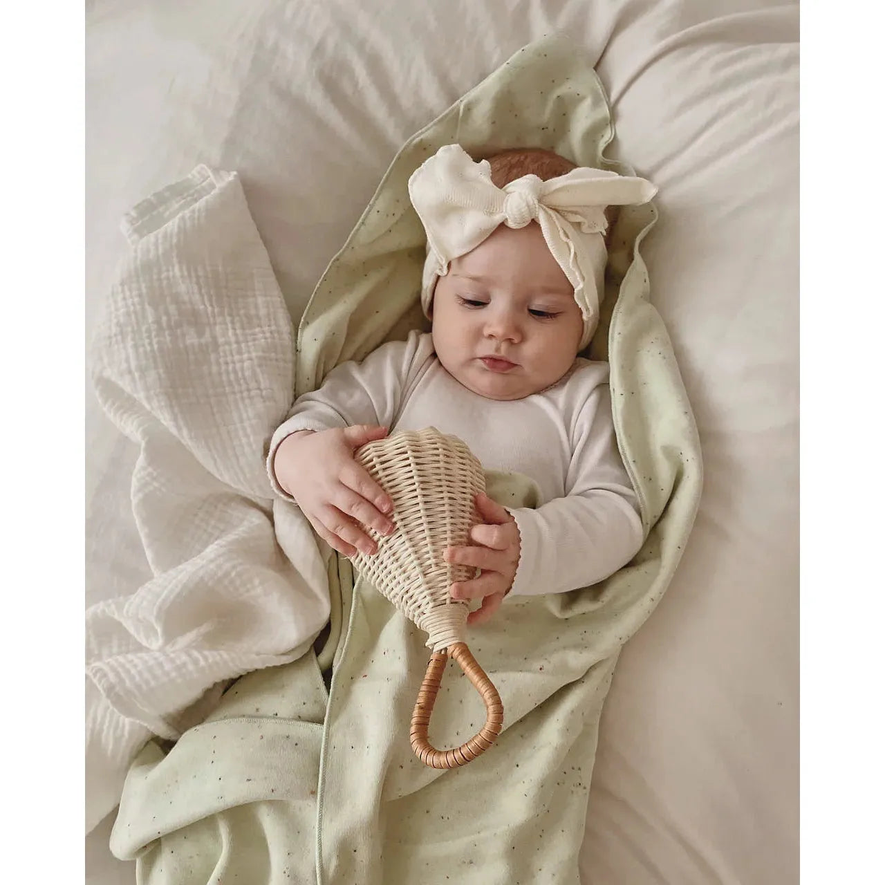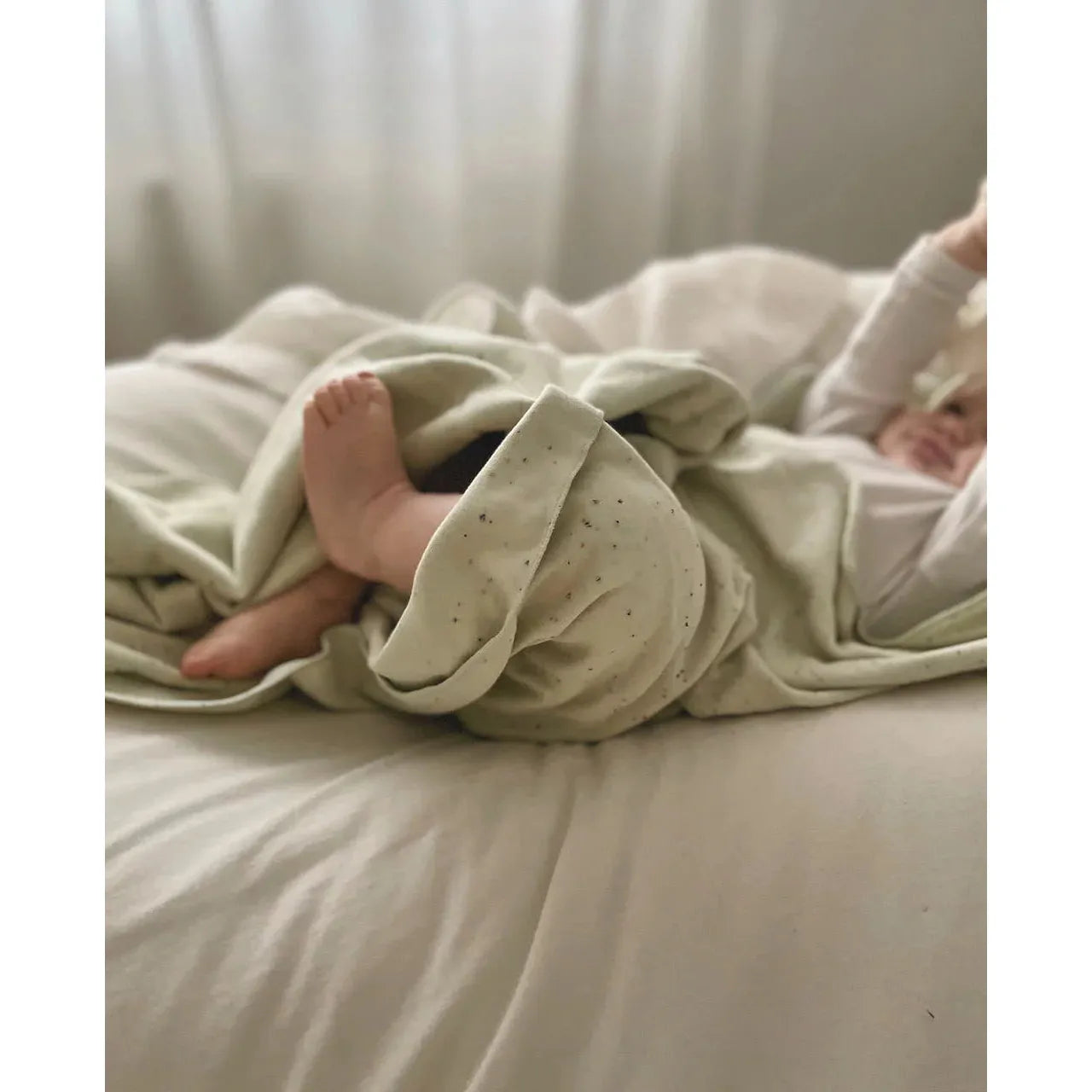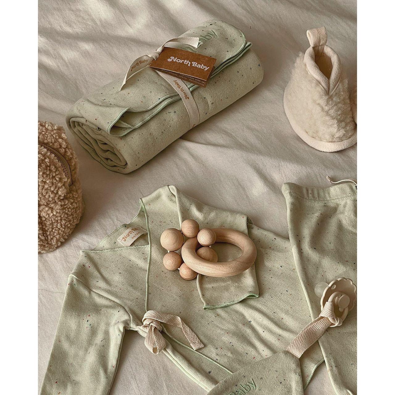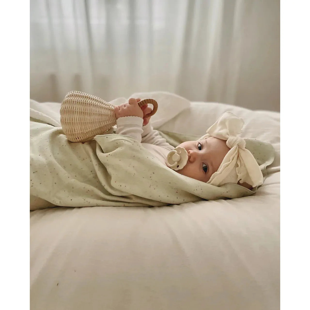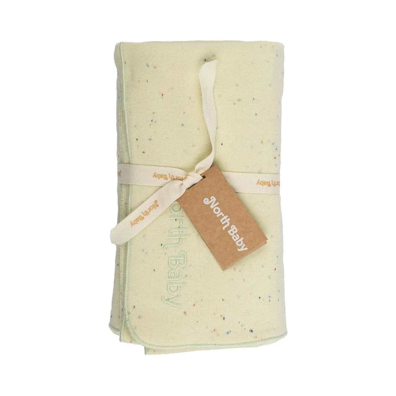 Una gran manta de punto suave en tono verde “aloe” jaspeado, diseñada para arropar al bebé desde el nacimiento y acompañarlo durante años.