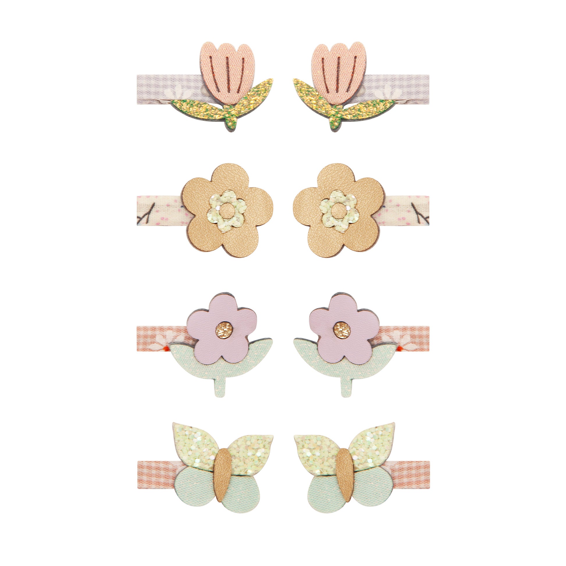 Set de 8 mini clips variados con formas de flores, corazones y mariposas.