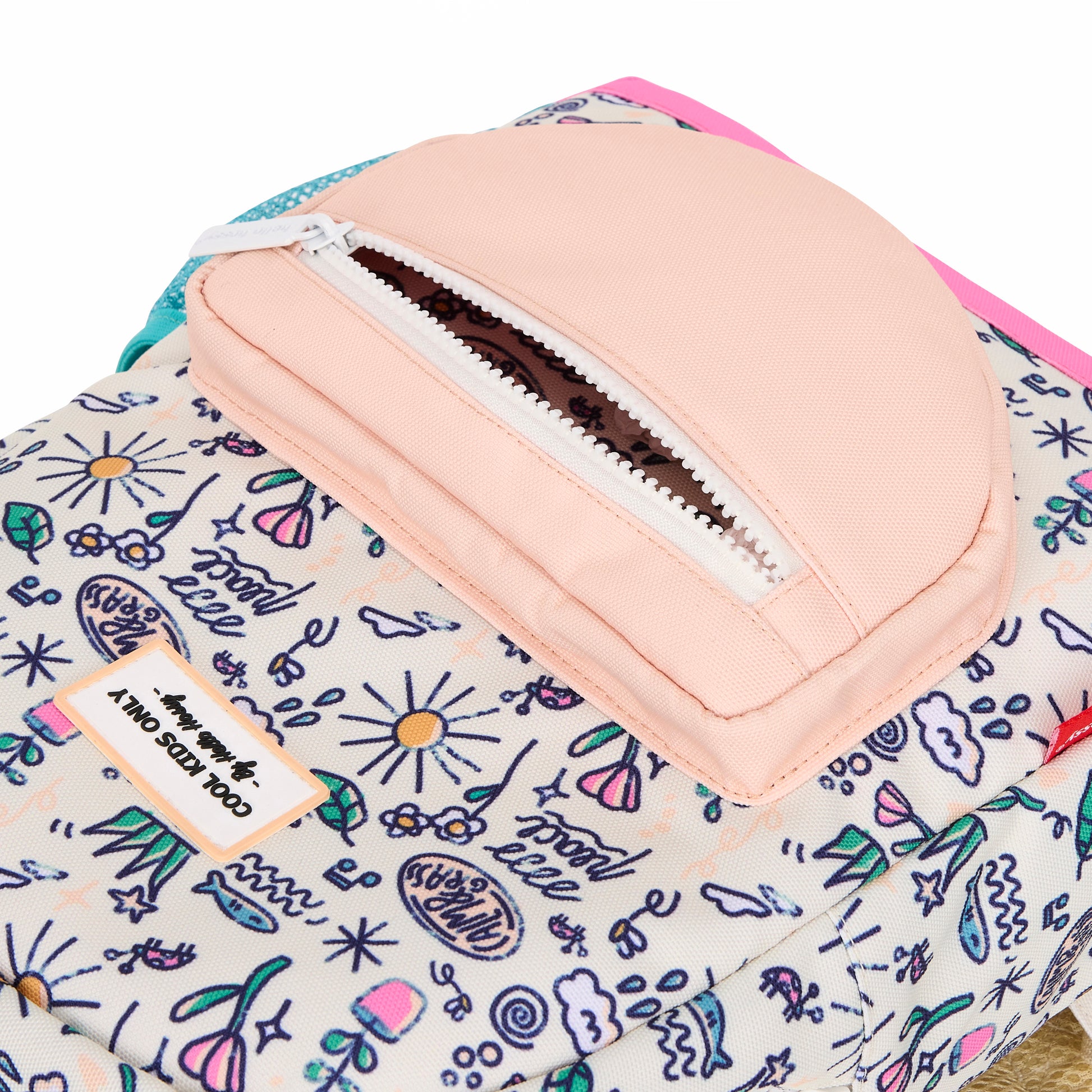 Dale un toque creativo a la rutina diaria con la mochila “Playground” de Hello Hossy: estampado de doodles (flores, soles, peces, palabras “peace”) sobre fondo crudo, combinados con bolsillo coral, asa rosa y detalles turquesa.