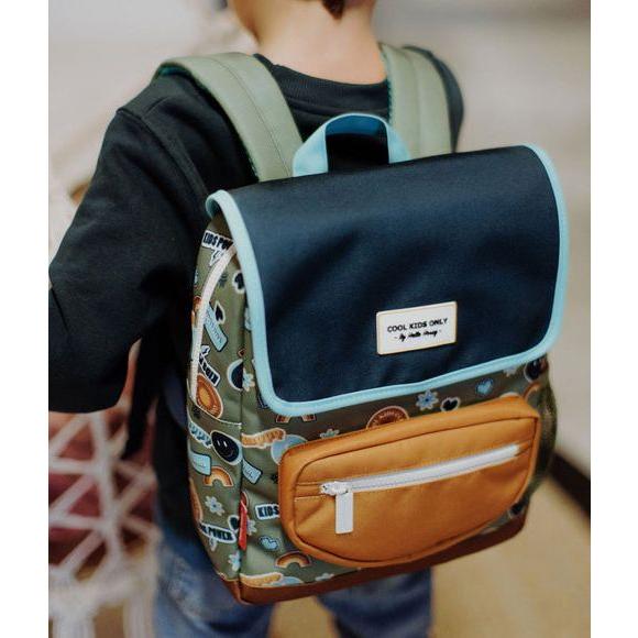 Llena de buen rollo tus días con el estampado Smiley: base verde oliva con iconos felices (caritas, arcoíris y lemas “happy”), tapa azul marino con ribete turquesa y bolsillo frontal mostaza.
