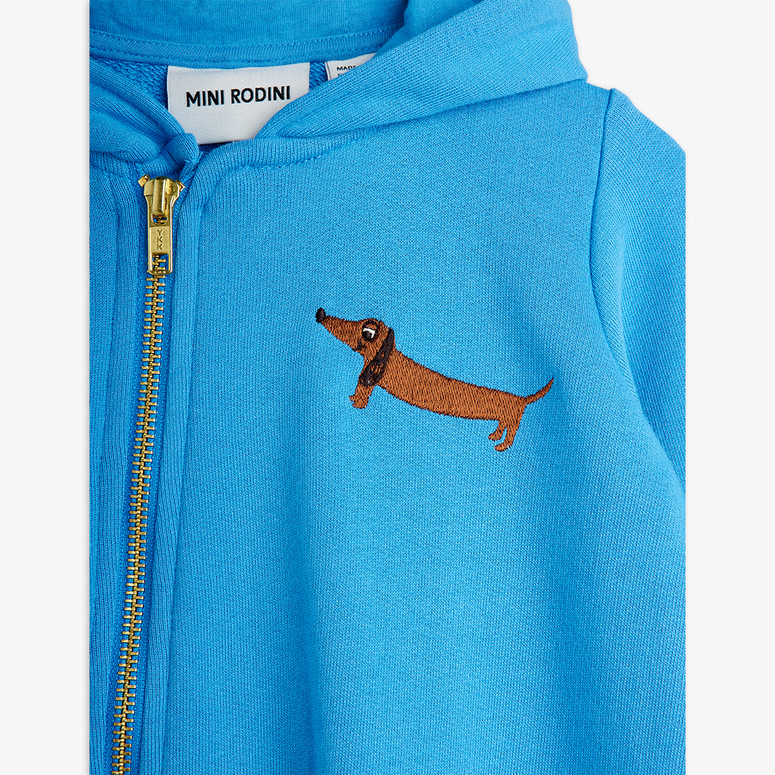Cómodo, simpático y lleno de estilo. Este mono con capucha en color azul cielo es una prenda perfecta para los días de juego y descanso. El bordado del perro salchicha en el pecho le da ese toque divertido que caracteriza a Mini Rodini, mientras que la cremallera frontal facilita el cambio.