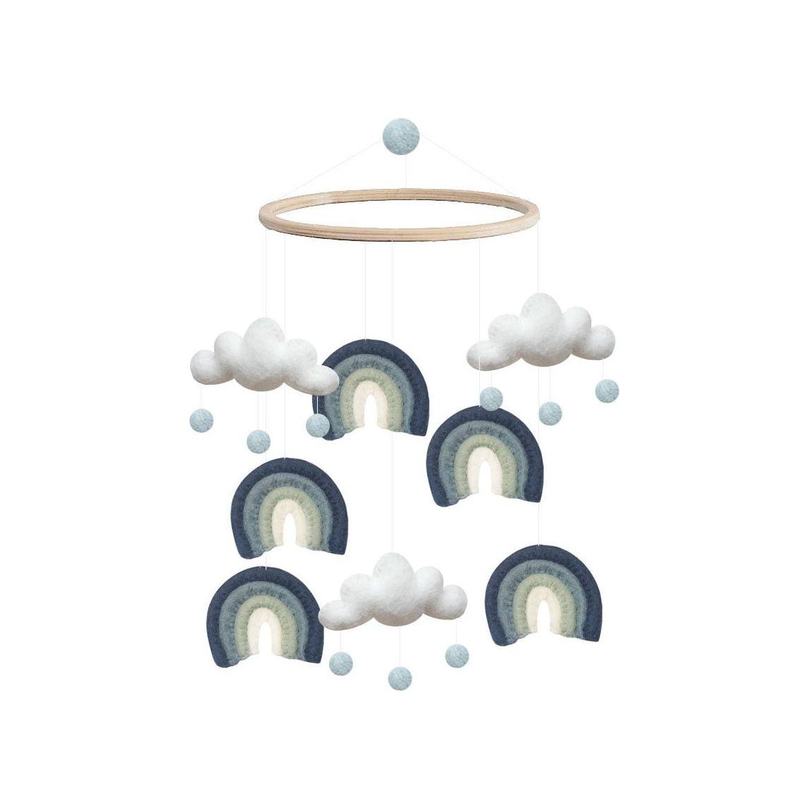 El Móvil Arcoíris Azul de Gamcha es una encantadora pieza artesanal que aporta un toque lúdico y sereno a cualquier habitación infantil. Confeccionado a mano en Nepal por artesanas locales, este móvil presenta arcoíris de fieltro en tonos azules suspendidos de un aro metálico, acompañados de suaves detalles que evocan un cielo lleno de aventuras. Su diseño minimalista y elegante lo convierte en una pieza decorativa ideal para cualquier espacio.