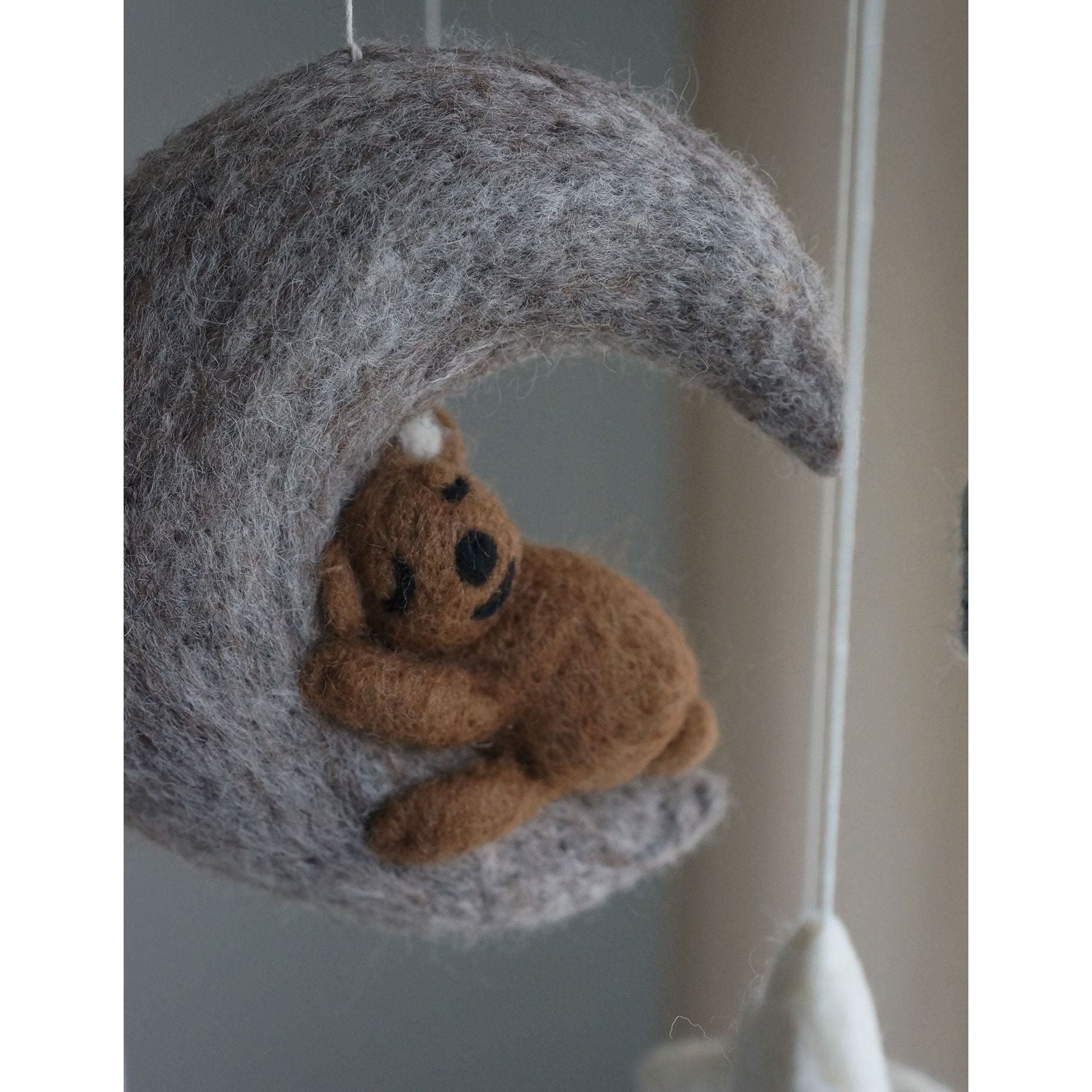 El Móvil de Cuna Oso Gris y Luna de Gamcha es una pieza artesanal encantadora que aporta un toque lúdico y sereno a cualquier habitación infantil. Confeccionado a mano en Nepal por artesanas locales, este móvil presenta un oso de fieltro en tonos grises suspendido de un aro metálico, acompañado de suaves detalles que evocan un ambiente nocturno. Su diseño minimalista y elegante lo convierte en una pieza decorativa ideal para cualquier espacio.