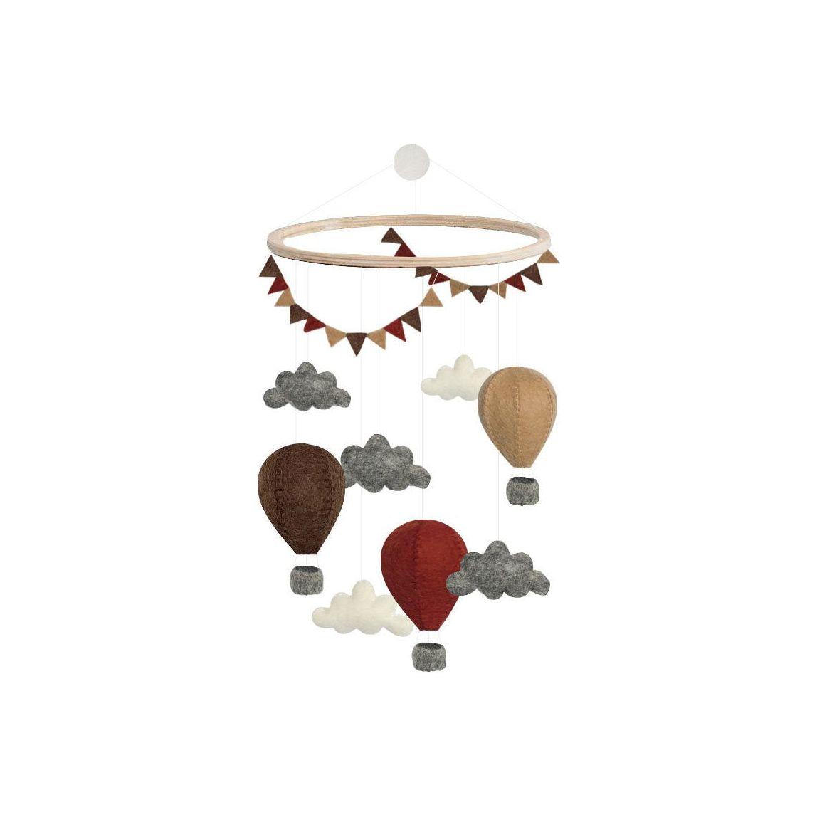 El Móvil de Globos Aerostáticos con Banderines en Tonos Beige y Marrón de Gamcha es una encantadora pieza artesanal que aporta un toque lúdico y sereno a cualquier habitación infantil. Confeccionado a mano en Nepal por artesanas locales, este móvil presenta globos aerostáticos de fieltro en tonos beige y marrón suspendidos de un aro metálico, acompañados de suaves detalles que evocan un cielo lleno de aventuras. Su diseño minimalista y elegante lo convierte en una pieza decorativa ideal para cualquier espacio.