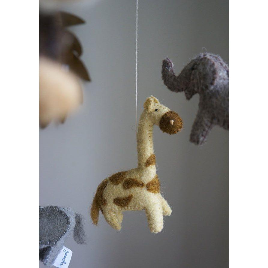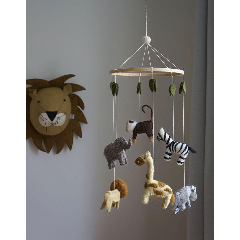 El Móvil Safari con Hojas de Gamcha es una encantadora pieza artesanal que aporta un toque lúdico y sereno a cualquier habitación infantil. Confeccionado a mano en Nepal por artesanas locales, este móvil presenta animales de fieltro como elefantes, jirafas, cebras y leones suspendidos de un aro metálico, acompañados de suaves hojas que evocan un ambiente natural. Su diseño minimalista y elegante lo convierte en una pieza decorativa ideal para cualquier espacio.