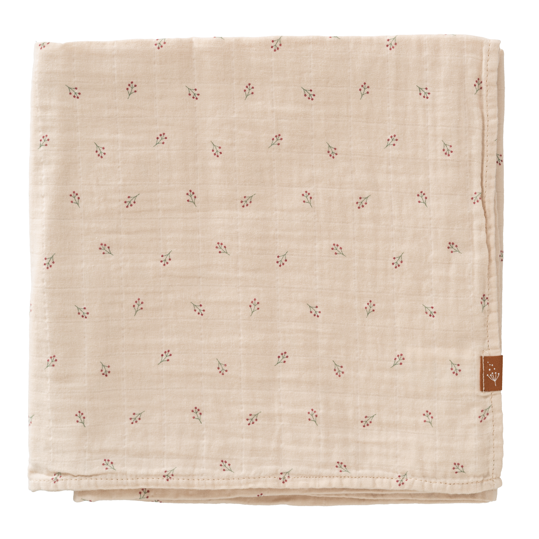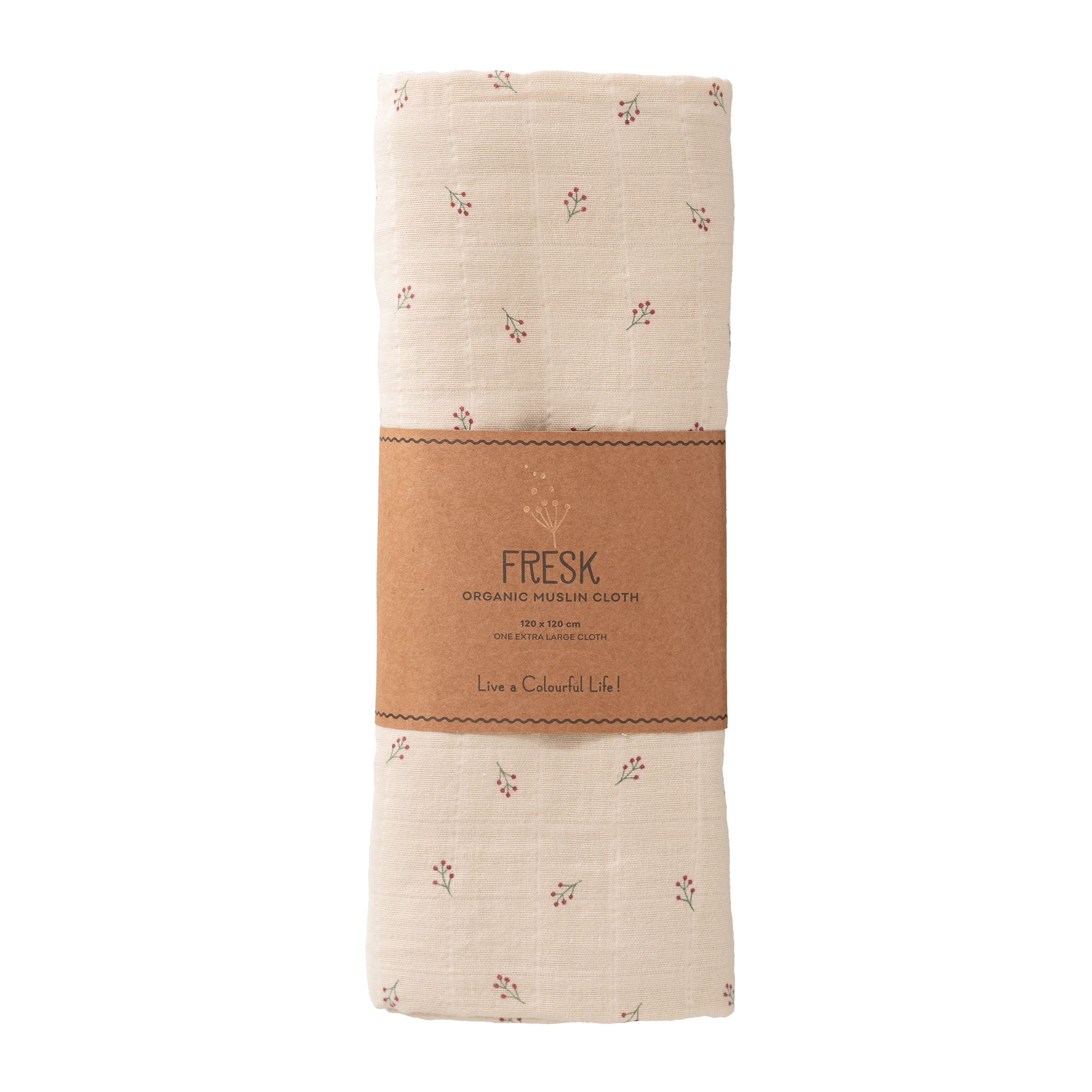 Una caricia en forma de tela. Esta muselina extra grande de Fresk está confeccionada en suave algodón orgánico, perfecta para envolver, proteger o acompañar a tu bebé en cada momento del día. Su delicado estampado floral sobre fondo crudo convierte este básico en una pieza tan funcional como bonita.