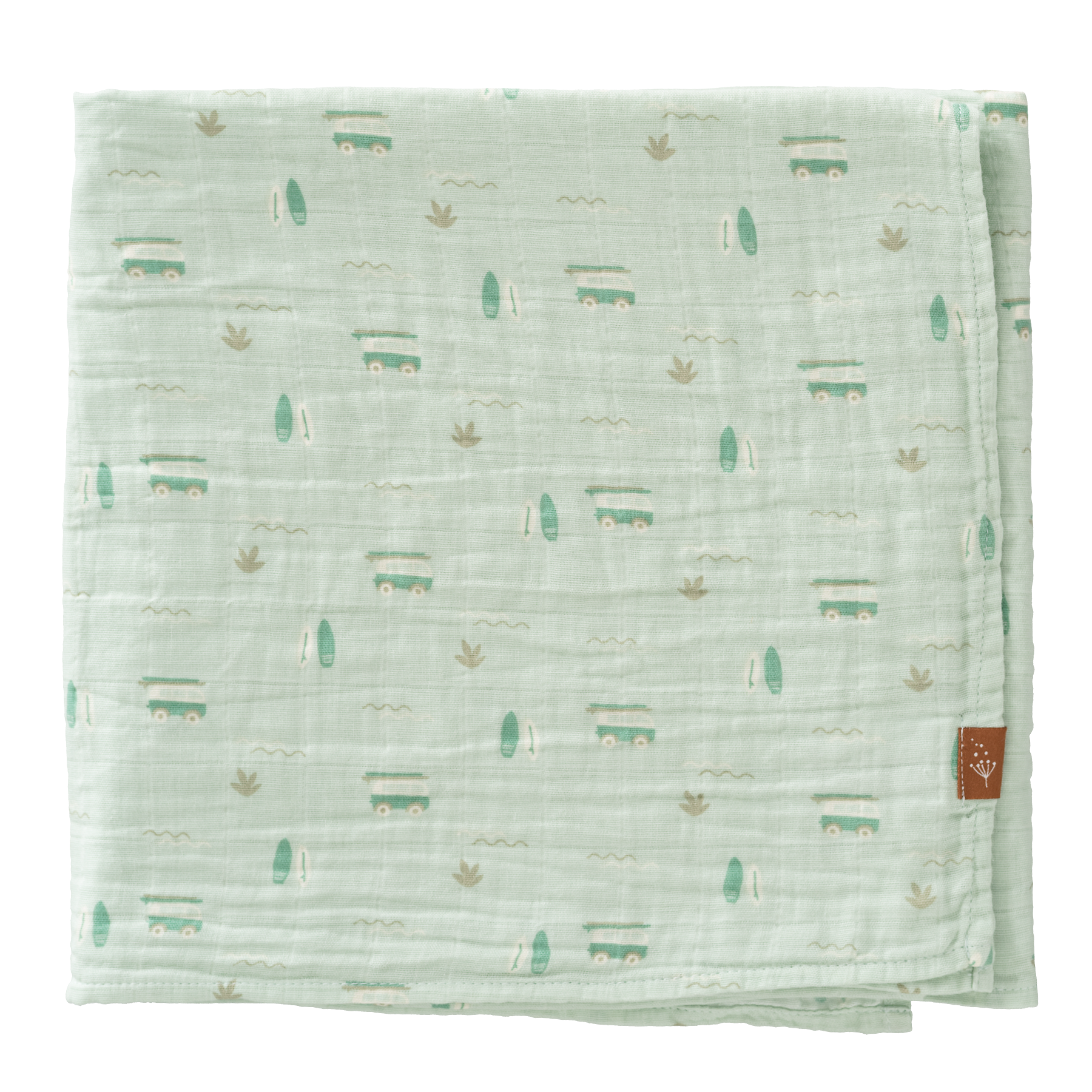 Un soplo de aire fresco en formato muselina. Con su diseño veraniego de furgonetas y tablas de surf sobre un suave fondo verde menta, esta muselina de gran tamaño es un imprescindible para acompañar a tu bebé en casa o en movimiento. Perfecta para arrullar, proteger, tapar o reconfortar.