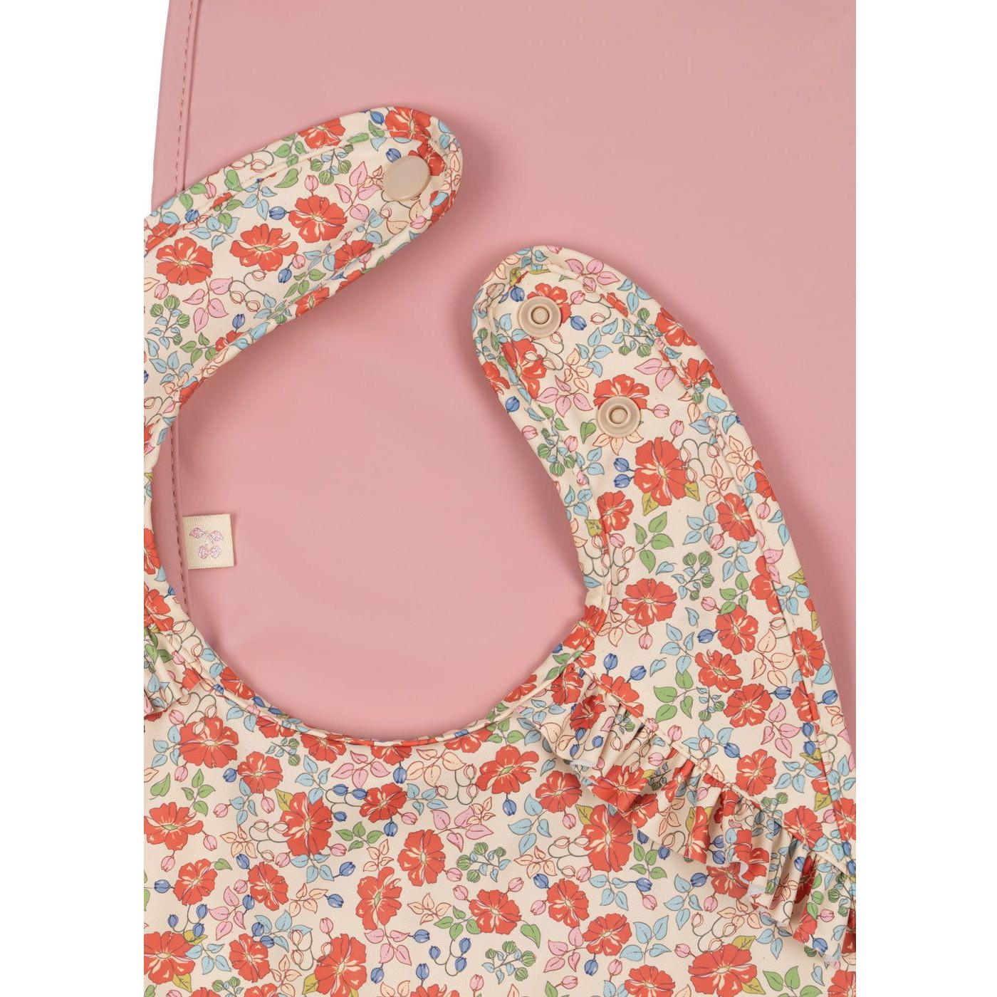 Este Pack de 2 Baberos Dinner Bibs con volantes de Konges Sløjd combina la practicidad del día a día con un toque encantador. Fabricados en material impermeable, destacan por su diseño cuidado con pequeños volantes en los laterales. Incluye un babero liso en tono rosa empolvado y otro con el precioso estampado floral White Frill.
