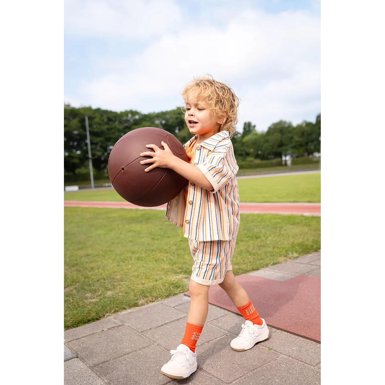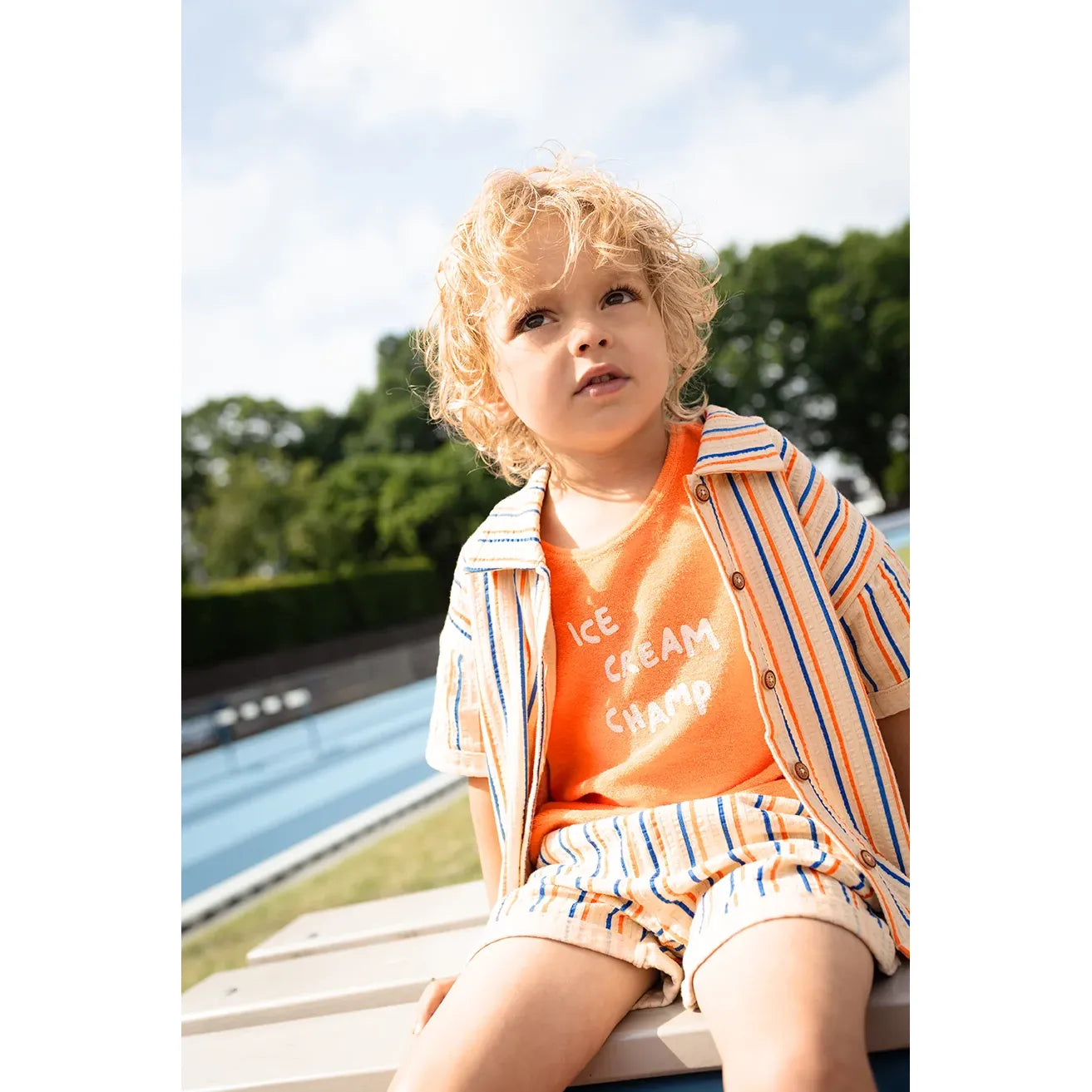 Pantalón corto tipo chino para bebé de Sproet & Sprout, confeccionado en 100% algodón orgánico. Su diseño en tono sésamo con finas rayas en azul y naranja le da un aire fresco, alegre y muy veraniego. Un básico con encanto, cómodo para el día a día y fácil de combinar con camisetas, polos o blusas ligeras.