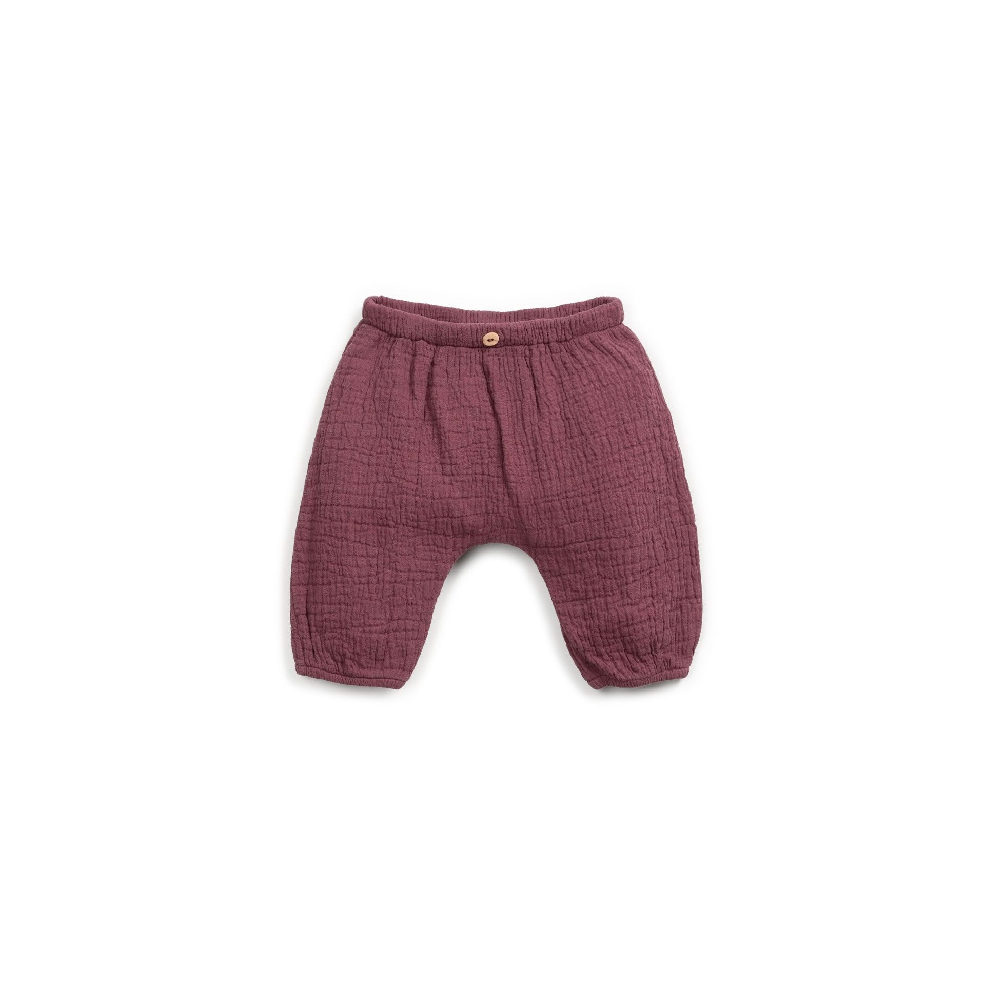 Un básico con carácter. Este pantalón de bebé en tono vino, confeccionado en suave gasa de algodón, es tan cómodo como versátil. Su diseño abombachado y cintura elástica con botón decorativo le dan un aire desenfadado y natural, ideal para los días de otoño e invierno.
