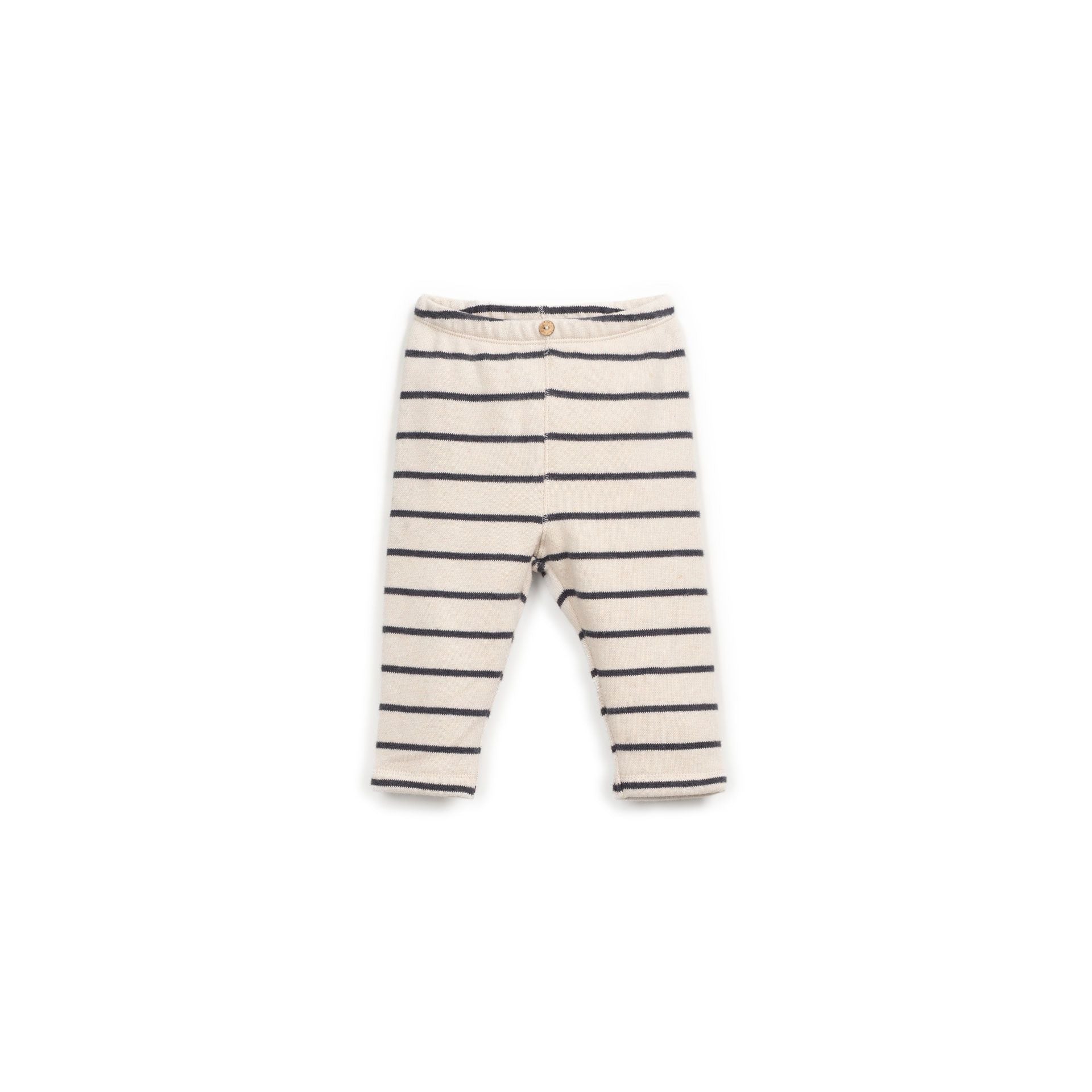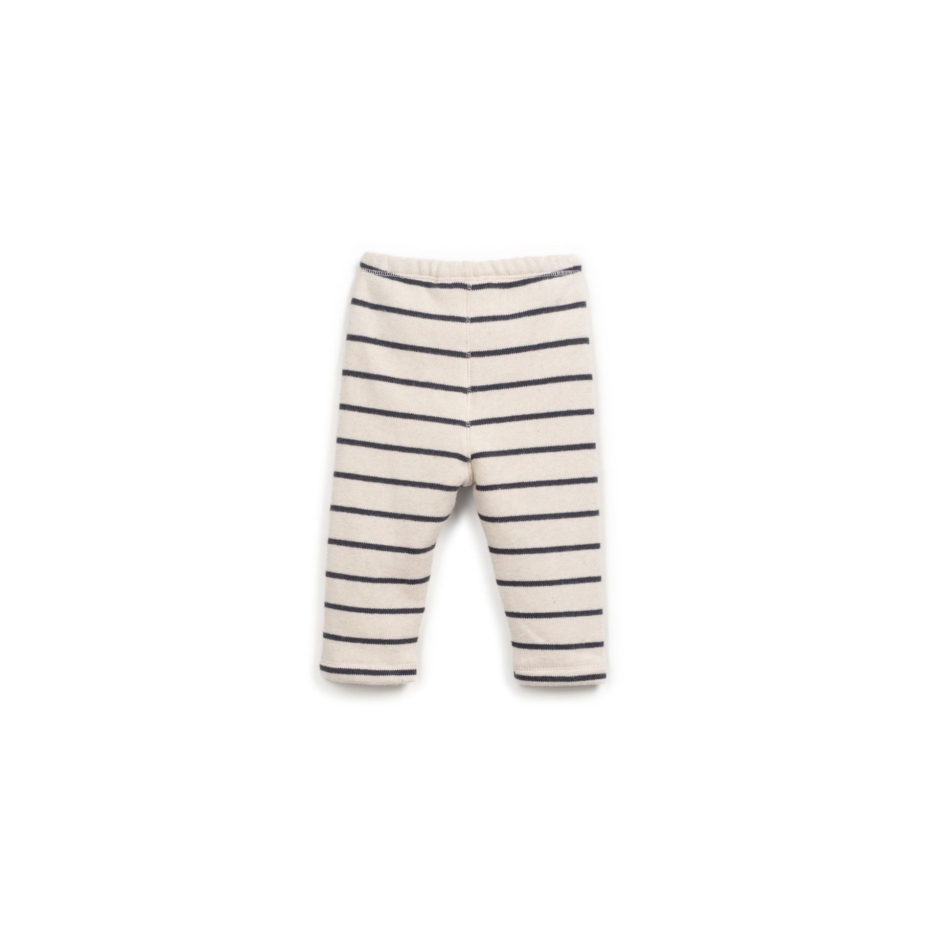 Un básico infalible con aire marinero. Este pantalón de punto para bebé, con rayas azul marino sobre fondo crudo, es suave, cómodo y muy versátil. Ideal para combinar con cualquier prenda de la colección y acompañar a los más peques en su día a día.