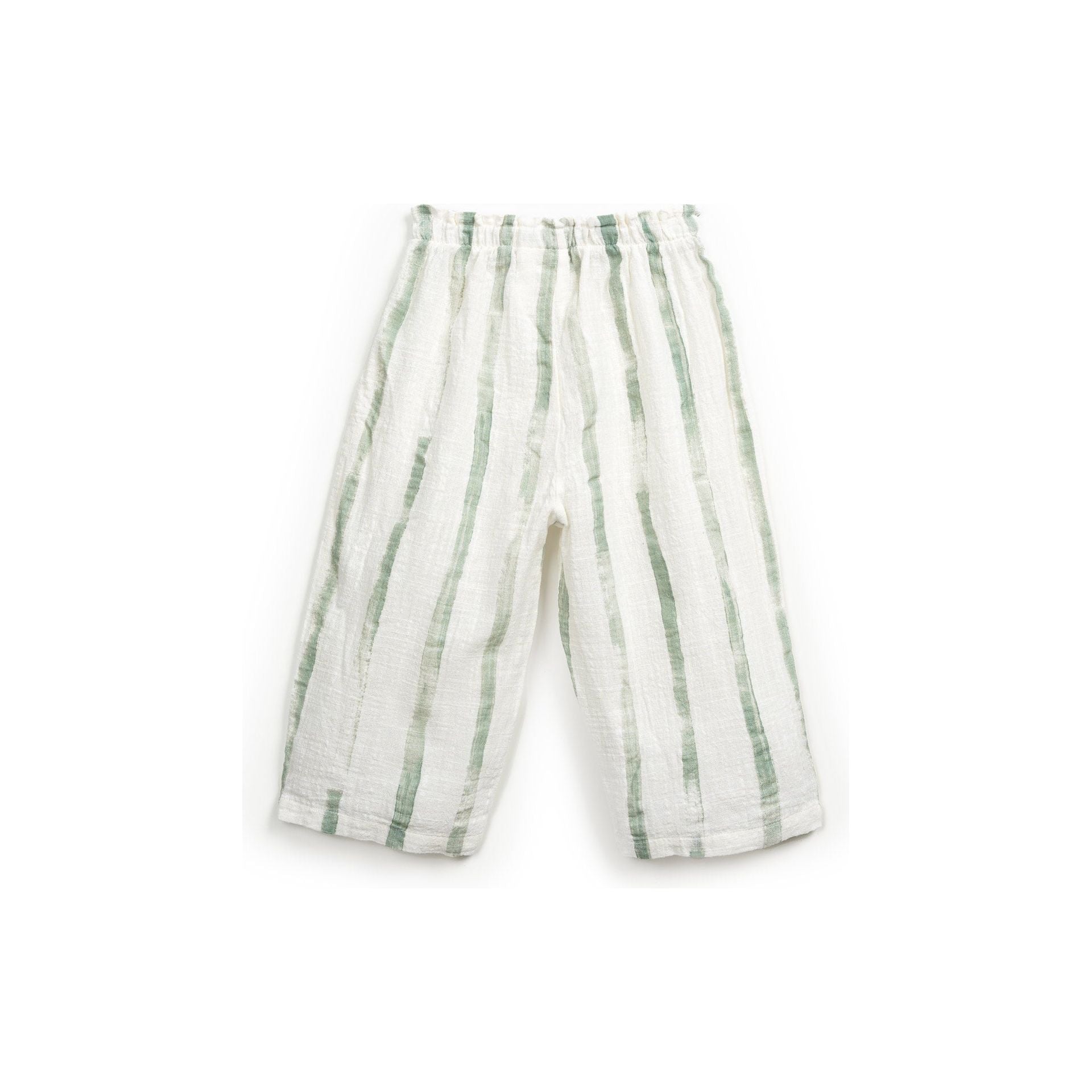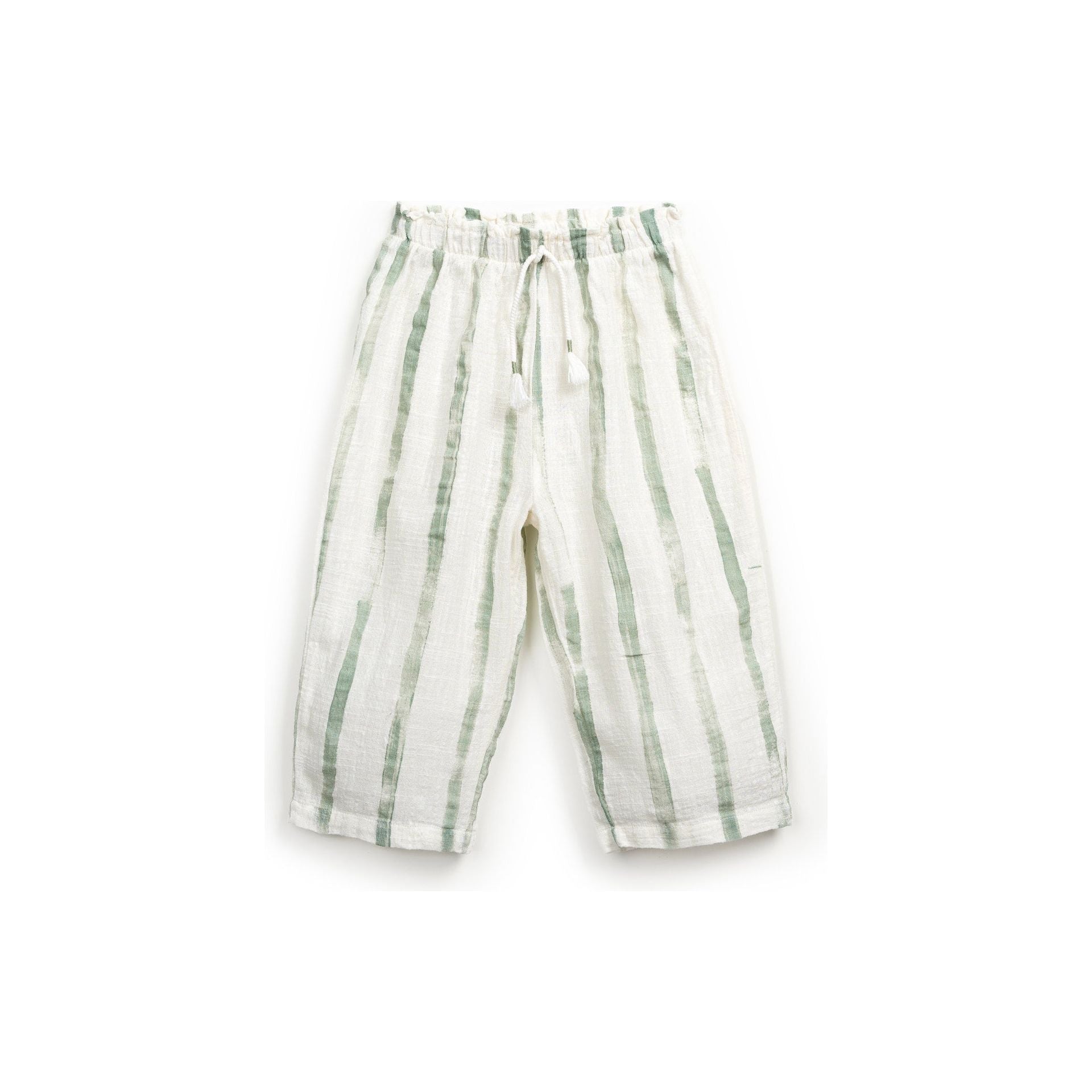 Estos pantalones para niña de la marca Play Up están confeccionados en 100% algodón orgánico, ofreciendo una prenda ligera, suave y altamente transpirable. Presentan un diseño de rayas verticales en tonos suaves, ideal para un look fresco y natural durante los meses de primavera y verano. El corte es holgado, y la cintura elástica permite un ajuste cómodo que se adapta al cuerpo sin apretar. Además, cuentan con el certificado OEKO-TEX® Standard 100, lo que garantiza que están completamente libres de sustancias nocivas, siendo seguros para el contacto directo con la piel sensible de las niñas.