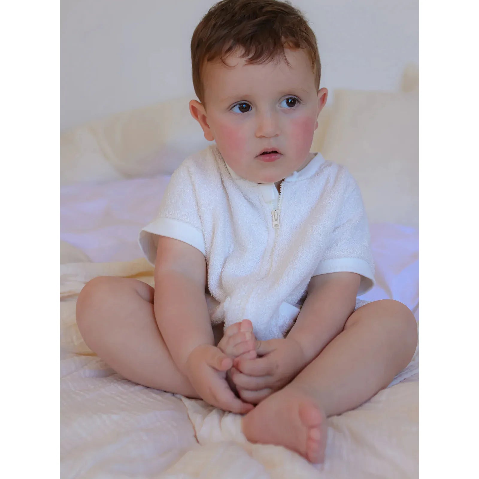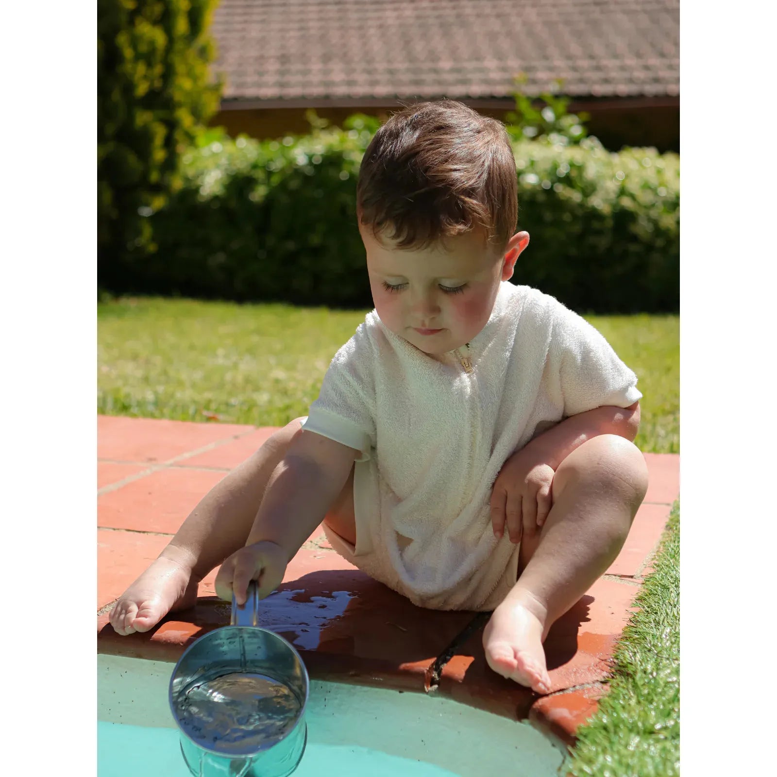 El Ponch n’ Romp de Lilulila es un pelele tipo poncho confeccionado en tejido rizo de bambú (terry), ideal para la playa, la piscina o después del baño. Su diseño combina la funcionalidad de un pelele con la comodidad de una toalla ligera, envolviendo al bebé con suavidad y frescor tras el agua o en días calurosos.