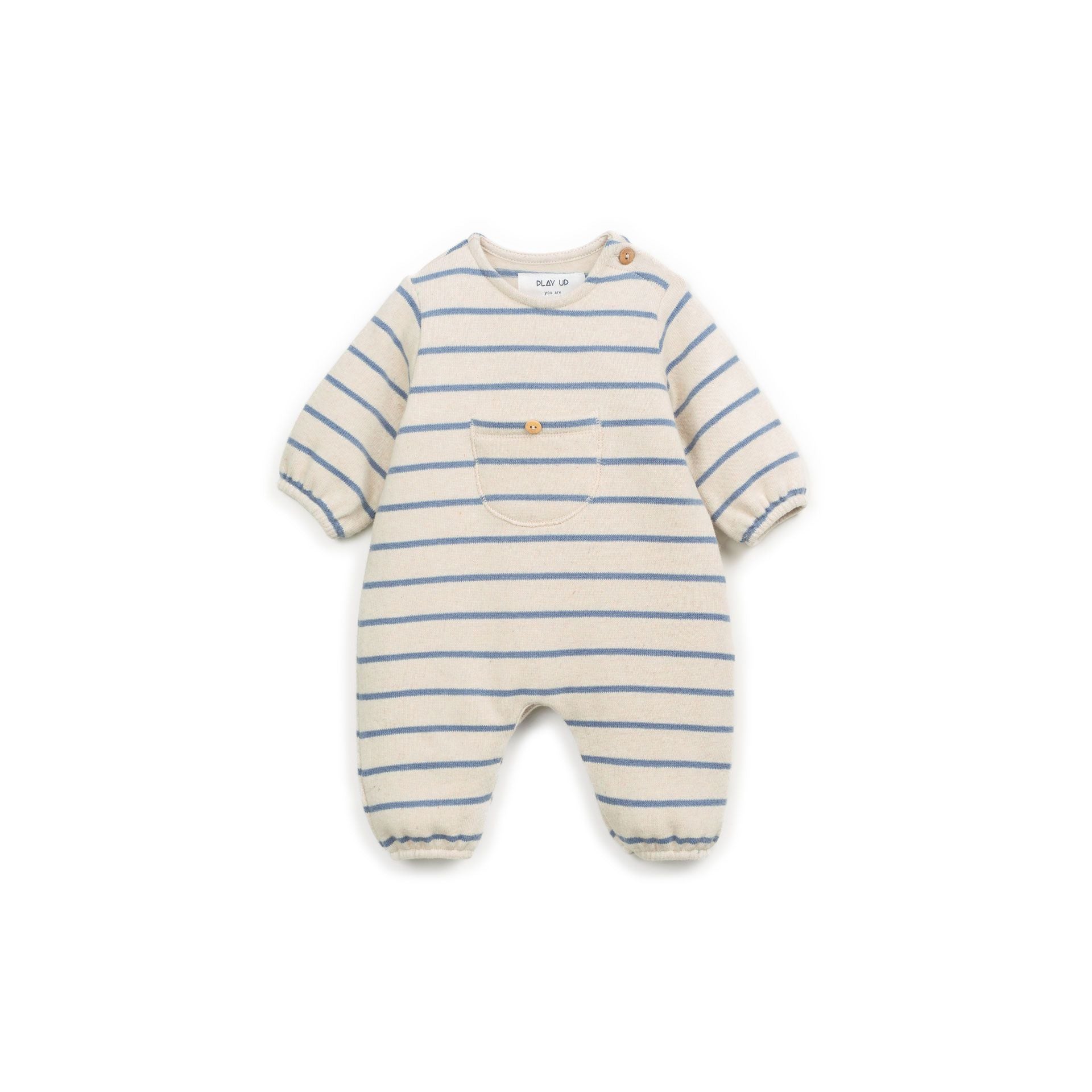 Este pelele de punto es una delicia para los días frescos. Confeccionado con una mezcla suave y sostenible, su diseño de rayas en tono azules sobre fondo crudo tiene un aire clásico pero con mucha personalidad. El bolsillo frontal con botón de madera le aporta un toque rústico y encantador.