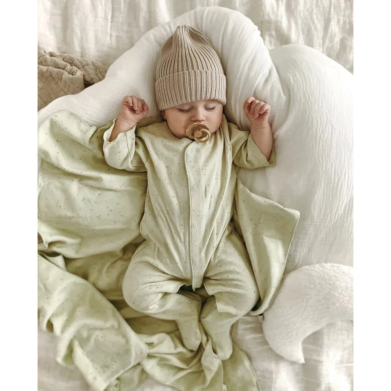 Un pelele entero de punto suave en tono verde pálido jaspeado, diseñado para ofrecer comodidad y libertad de movimiento desde la primera puesta.