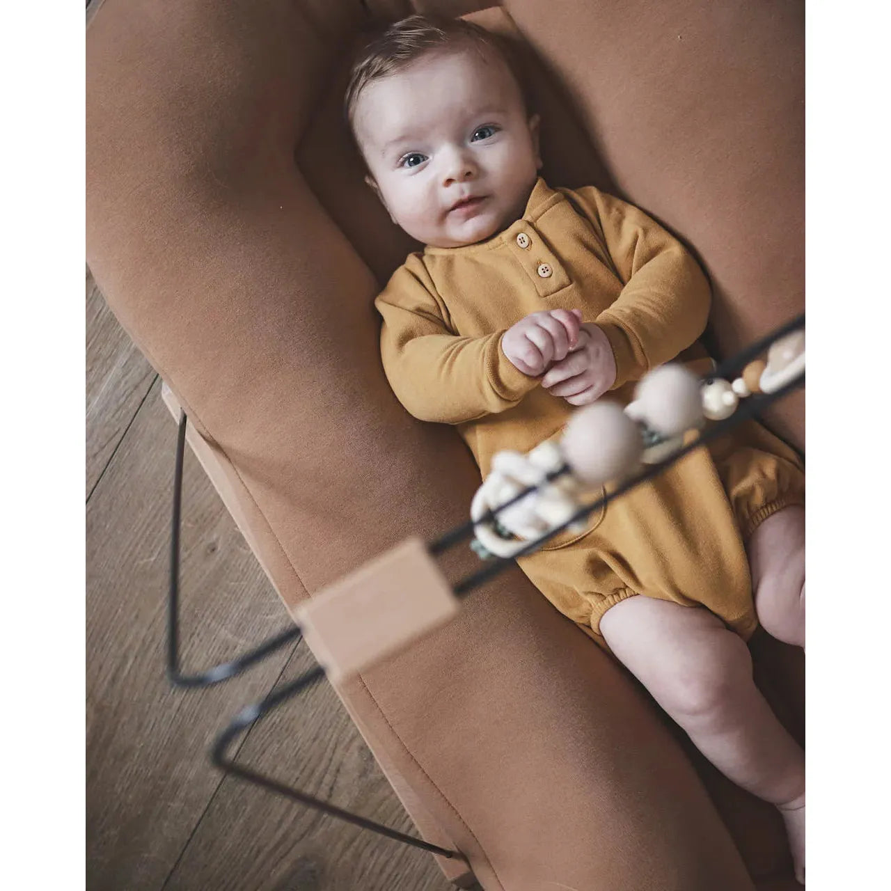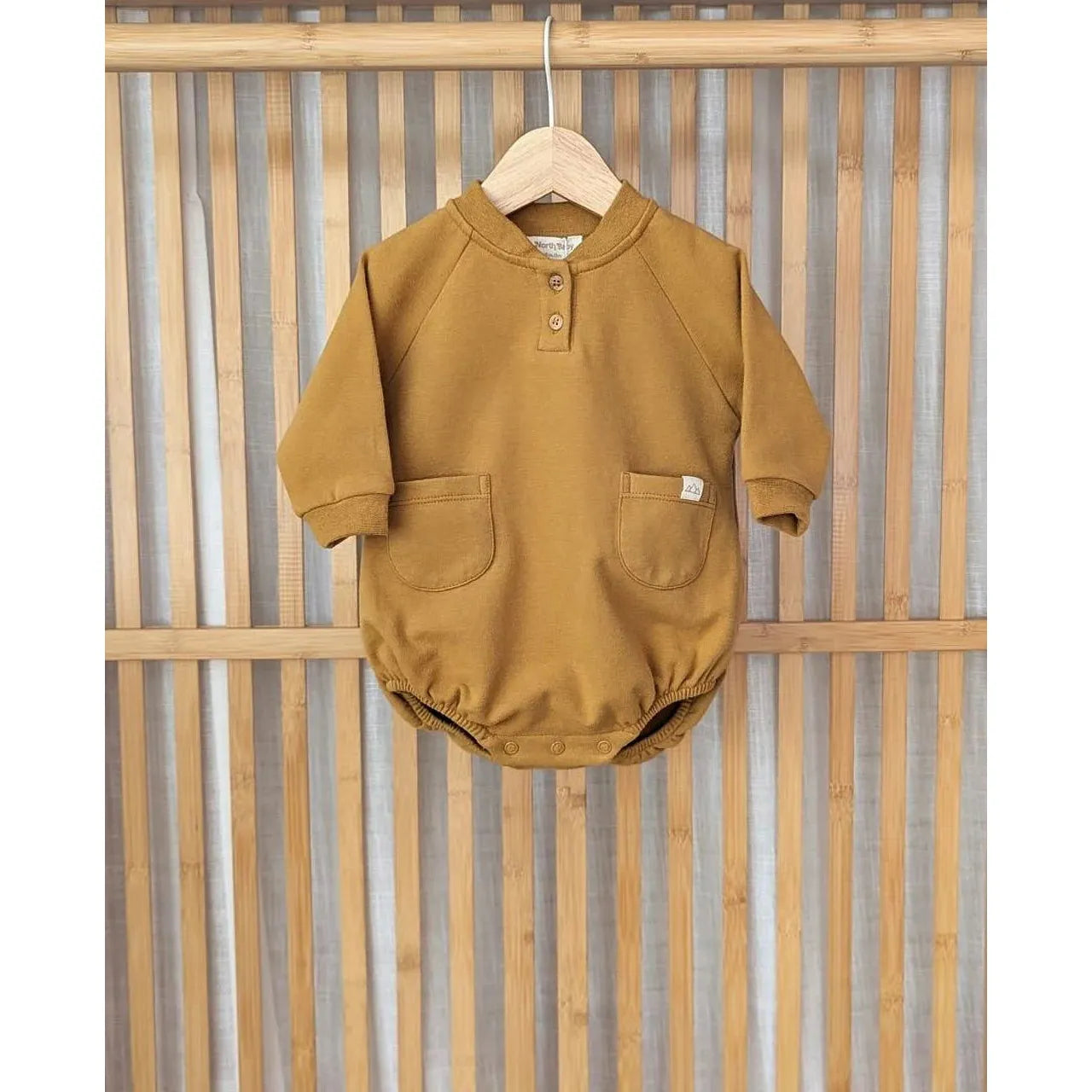 Un pelele de algodón orgánico con acabado cepillado “soft touch” en un tono curry profundo, ideal para mantener al bebé abrigado y con estilo.
