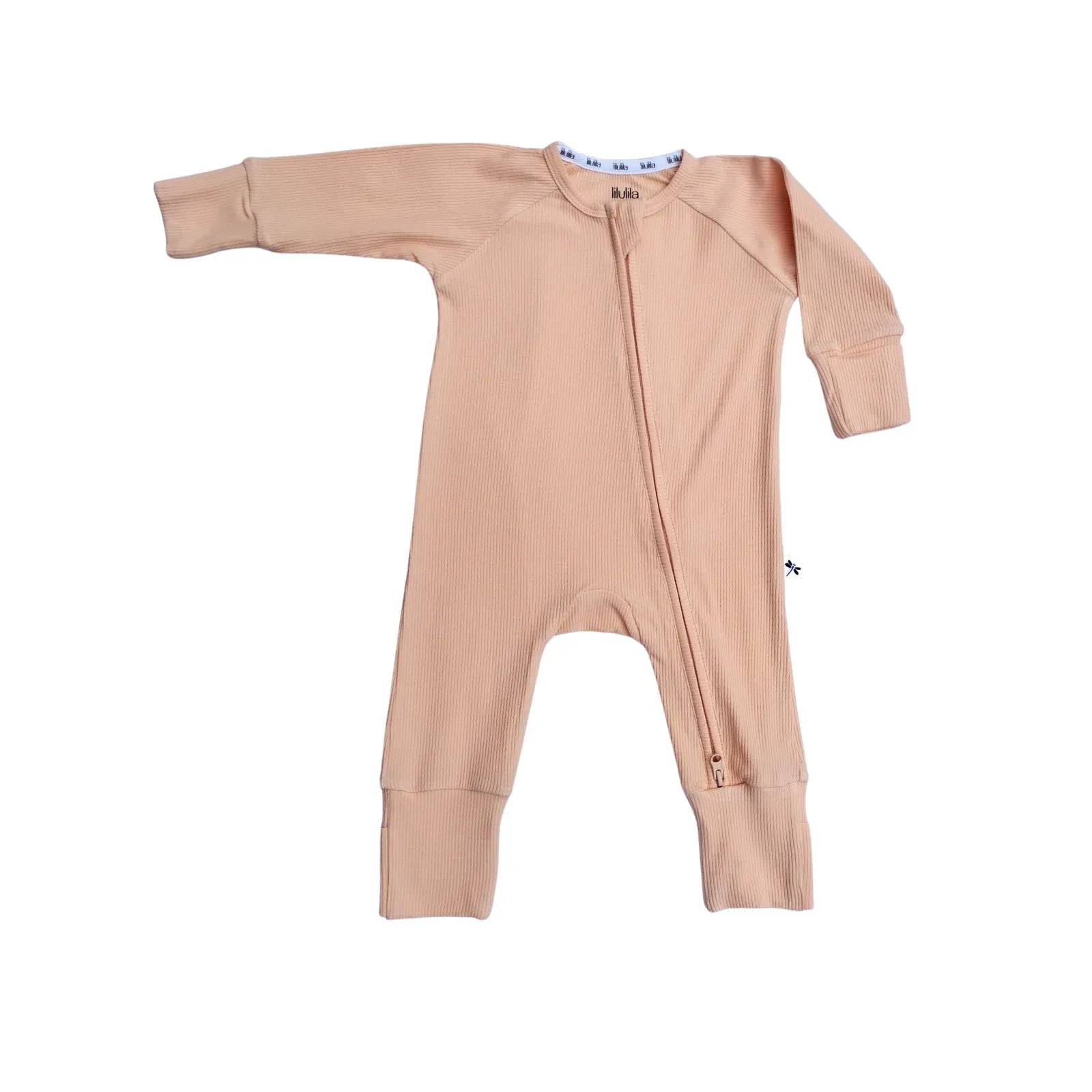 El Pijama Coral Ribbed de Lilulila está confeccionado en suave tejido de bambú orgánico con acabado canalé. Su diseño minimalista y el color coral hacen que sea tan práctico como bonito, ideal para acompañar a tu peque en noches tranquilas y cómodas.