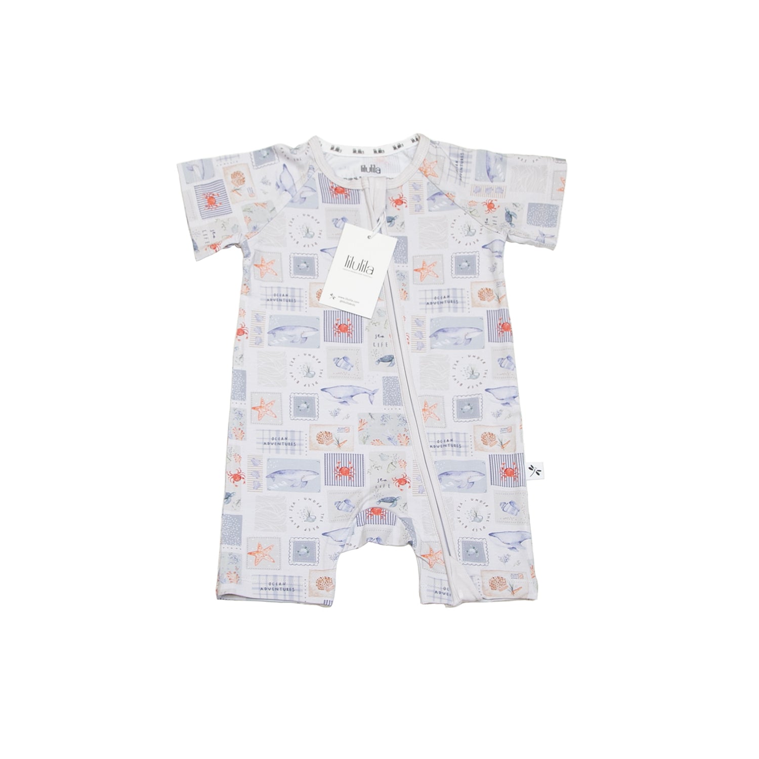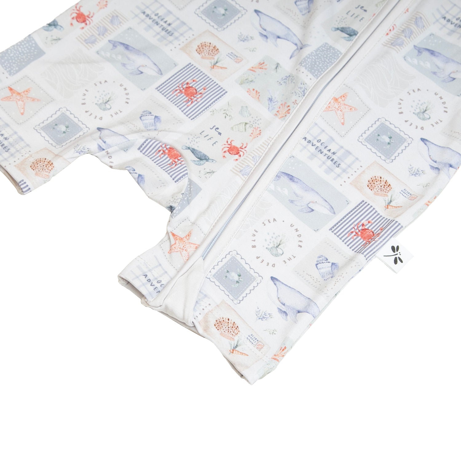 El Zippy Romper Ocean Life de Lilulila en versión corta es el pijama perfecto para los meses más cálidos. Su estampado con ilustraciones de animales marinos sobre fondo claro transmite calma y frescura, mientras que su diseño de manga corta y pantalón corto garantiza libertad de movimiento y confort en los días y noches de verano.
