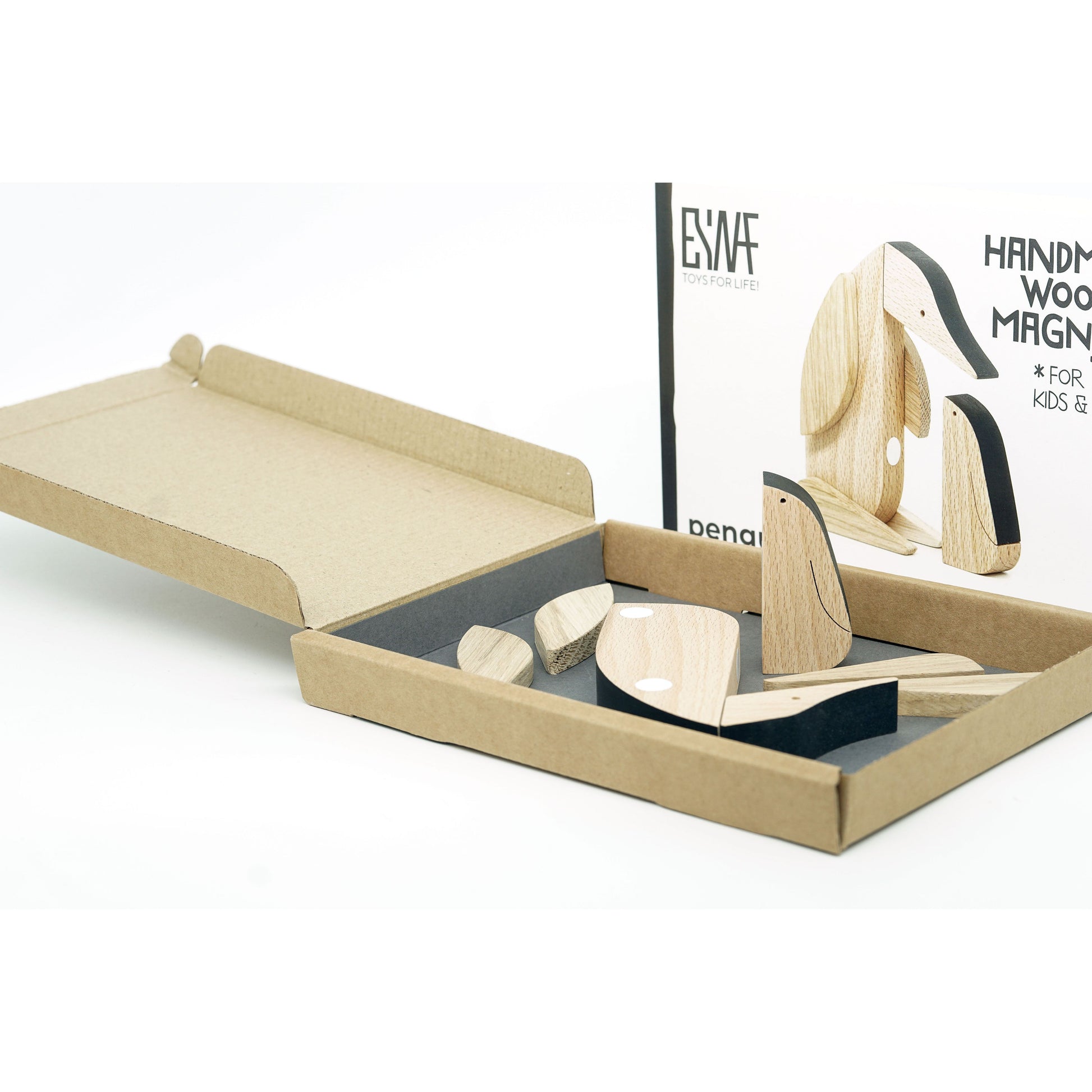 El Pingüino de Madera Magnético de Esnaf Toys forma parte de la colección Polar Stories. Este juguete artesanal está diseñado y fabricado a mano en Bulgaria por arquitectos y diseñadores. Confeccionado con madera maciza de haya y roble, incorpora un sistema de imanes que permite el movimiento de sus partes, fomentando la creatividad y el juego libre. Su diseño minimalista y elegante lo convierte en una pieza decorativa ideal para cualquier espacio.